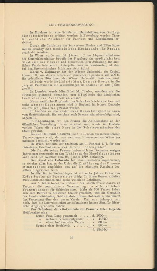 Marie v. Najmayer hat der Wiener Universität ein Capital übermittelt, von dessen Zinsen ein jährliches Stipendium von 300 fl. für ordentliche Hörerinnen der Wiener Universität bestritten wird.