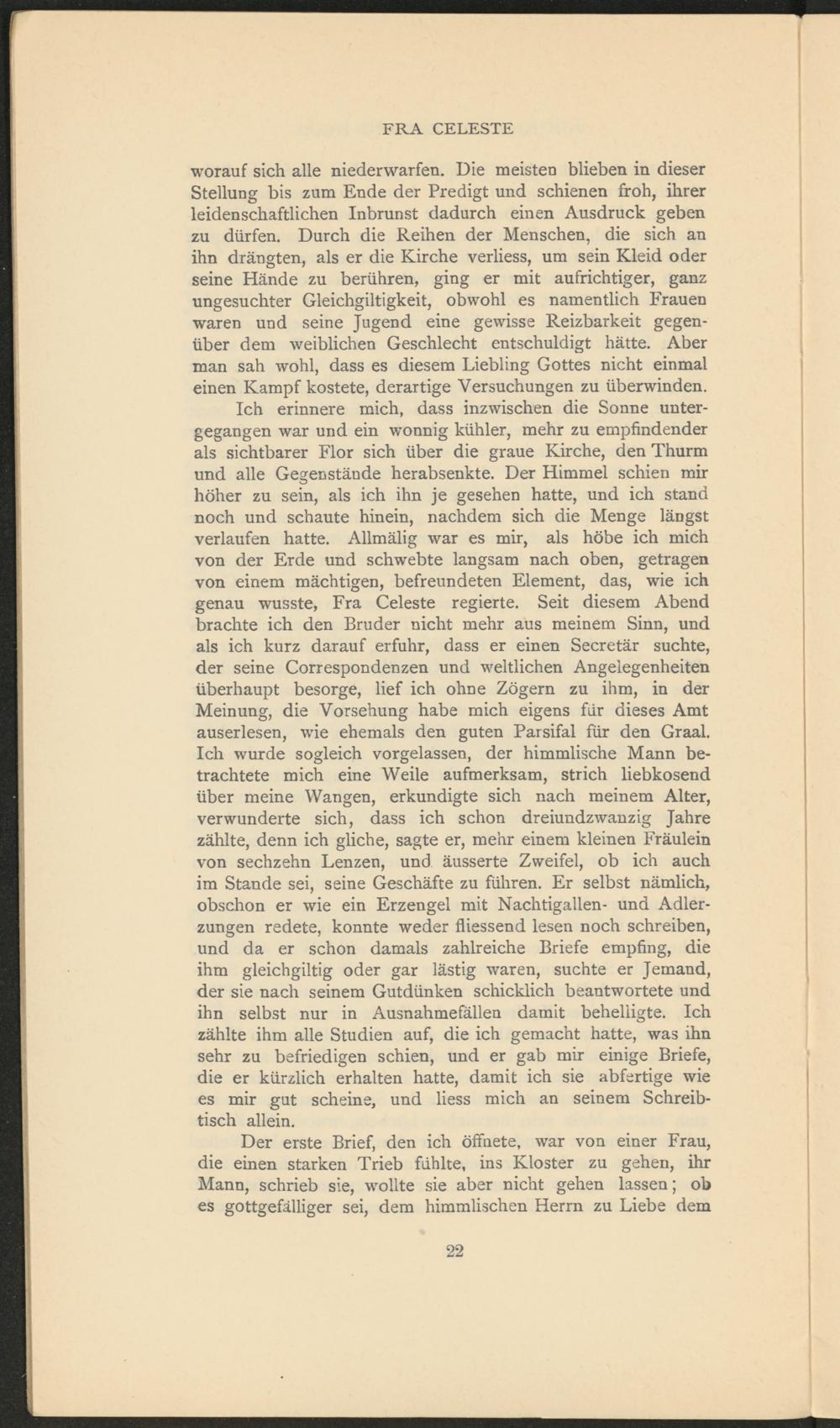 Ich erinnere mich, dass inzwischen die Sonne untergegangen war und ein wonnig kühler, mehr zu empfindender als sichtbarer Flor sich über die graue Kirche, den Thurm und alle Gegenstände herabsenkte. Der Himmel schien mir höher zu sein, als ich ihn je gesehen hatte, und ich stand noch und schaute hinein, nachdem sich die Menge läDgst verlaufen hatte. Allmälig war es mir, als höbe ich mich von der Erde und schwebte langsam nach oben, getragen von einem mächtigen, befreundeten Element, das, wie ich genau wusste, Fra Celeste regierte. Seit diesem Abend brachte ich den Bruder nicht mehr aus meinem Sinn, und als ich kurz darauf erfuhr, dass er einen Secretär suchte, der seine Correspondenzen und weltlichen Angelegenheiten überhaupt besorge, lief ich ohne Zögern zu ihm, in der Meinung, die Vorsehung habe mich eigens für dieses Amt auserlesen, wie ehemals den guten Parsifal für den Graal. Ich wurde sogleich vorgelassen, der himmlische Mann betrachtete mich eine Weile aufmerksam, strich liebkosend über meine Wangen, erkundigte sich nach meinem Alter, verwunderte sich, dass ich schon dreiundzwanzig Jahre zählte, denn ich gliche, sagte er, mehr einem kleinen Fräulein von sechzehn Lenzen, und äusserte Zweifel, ob ich auch im Stande sei, seine Geschäfte zu führen. Er selbst nämlich, obschon er wie ein Erzengel mit Nachtigallen- und Adlerzungen redete, konnte weder fliessend lesen noch schreiben, und da er schon damals zahlreiche Briefe empfing, die ihm gleichgiltig oder gar lästig waren, suchte er Jemand, der sie nach seinem Gutdünken schicklich beantwortete und ihn selbst nur in Ausnahmefällen damit behelligte. Ich zählte ihm alle Studien auf, die ich gemacht hatte, was ihn sehr zu befriedigen schien, und er gab mir einige Briefe, die er kürzlich erhalten hatte, damit ich sie abfertige wie es mir gut scheine, und Hess mich an seinem Schreibtisch allein.