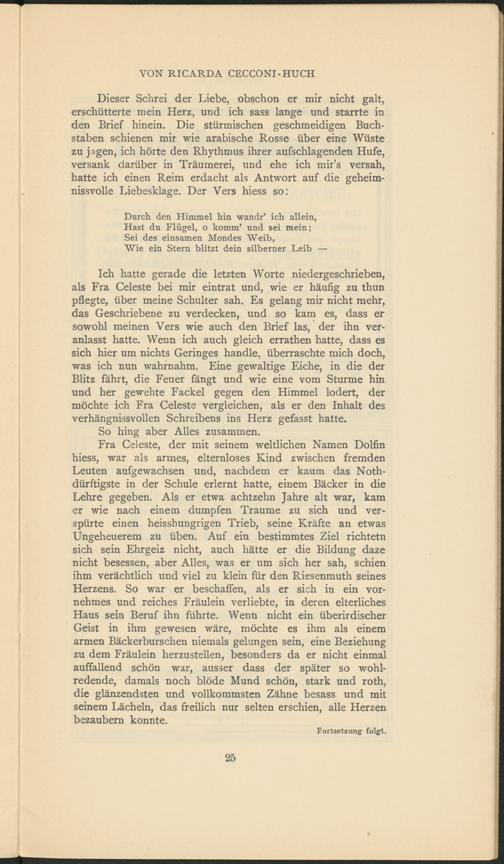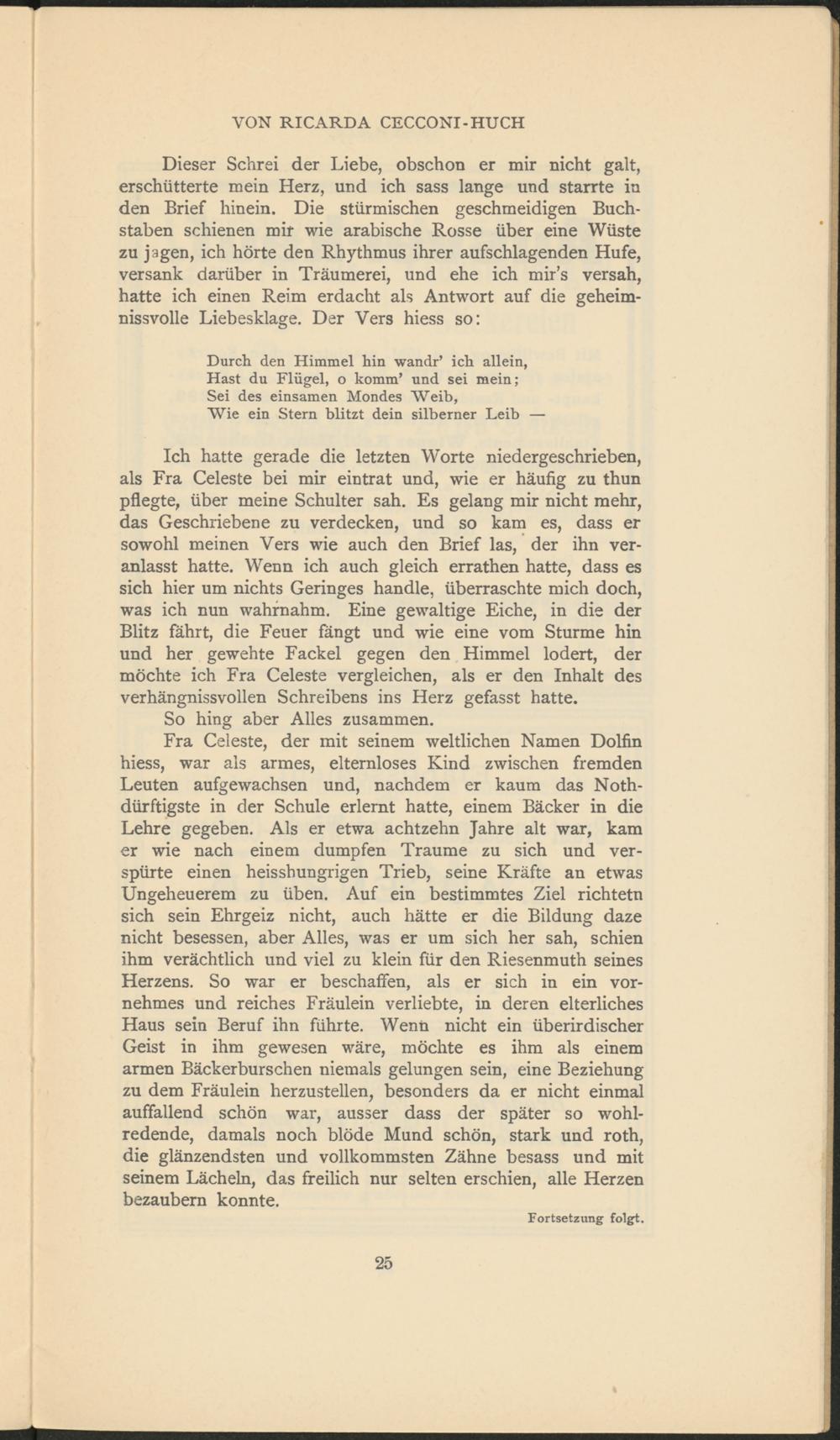Fra Celeste, der mit seinem weltlichen Namen Dolfin hiess, war als armes, elternloses Kind zwischen fremden Leuten aufgewachsen und, nachdem er kaum das Noth- dürftigste in der Schule erlernt hatte, einem Bäcker in die Lehre gegeben. Als er etwa achtzehn Jahre alt war, kam er wie nach einem dumpfen Traume zu sich und verspürte einen heisshungrigen Trieb, seine Kräfte an etwas Ungeheuerem zu üben. Auf ein bestimmtes Ziel richtetn sich sein Ehrgeiz nicht, auch hätte er die Bildung daze nicht besessen, aber Alles, was er um sich her sah, schien ihm verächtlich und viel zu klein für den Riesenmuth seines Herzens. So war er beschaffen, als er sich in ein vornehmes und reiches Fräulein verliebte, in deren elterliches Haus sein Beruf ihn führte. Wenn nicht ein überirdischer Geist in ihm gewesen wäre, möchte es ihm als einem armen Bäckerburschen niemals gelungen sein, eine Beziehung zu dem Fräulein herzustellen, besonders da er nicht einmal auffallend schön war, ausser dass der später so wohlredende, damals noch blöde Mund schön, stark und roth, die glänzendsten und vollkommsten Zähne besass und mit seinem Lächeln, das freilich nur selten erschien, alle Herzen bezaubern konnte.