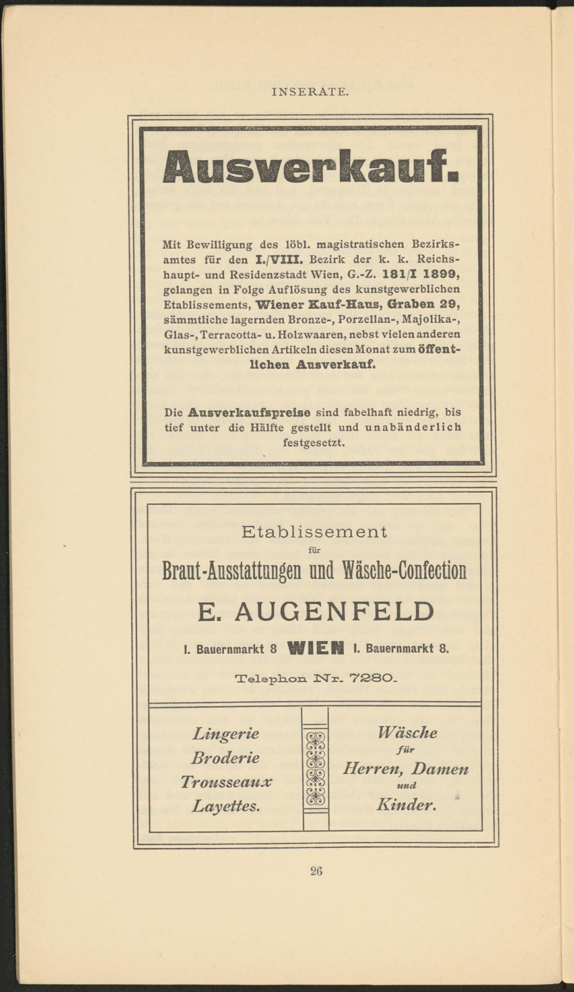 Mit Bewilligung des löbl. magistratischen Bezirksamtes für den I./VIII. Bezirk der k. k. Reichshaupt- und Residenzstadt Wien, G.-Z. 181/1 1899, gelangen in Folge Auflösung des kunstgewerblichen Etablissements, Wiener Kauf-Haus, Graben 29, sämmtliche lagernden Bronze-, Porzellan-, Majolika-, Glas-, Terracotta- u. Holzwaaren, nebst vielen anderen | kunstgewerblichen Artikeln diesen Monat zum öffentlichen Ausverkauf.