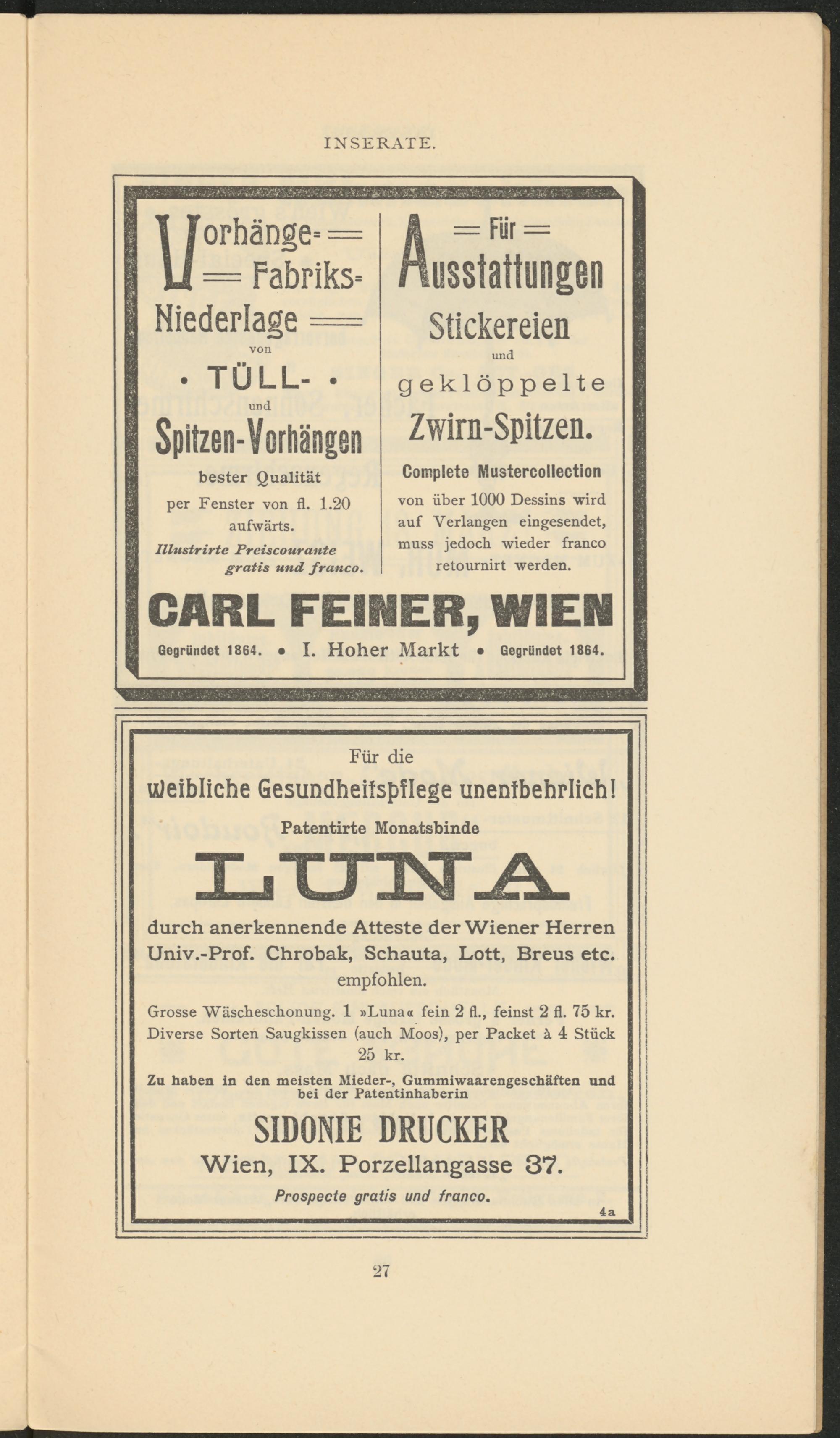 Grosse Wäscheschonung. 1 »Luna« fein 2 fl., feinst 2 fl. 75 kr. Diverse Sorten Saugkissen (auch Moos), per Packet ä 4 Stück 25 kr.