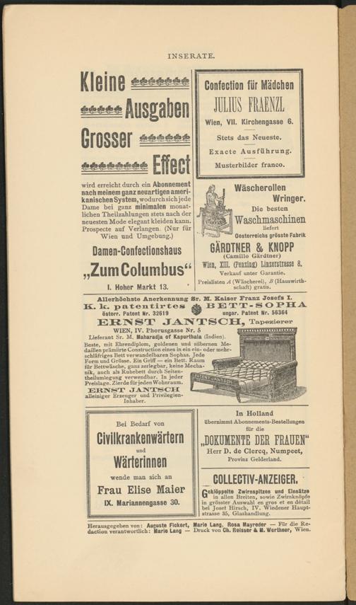 Herausgegeben von: Auguste Fickert, Marie Lang, Rosa Mayreder — Für die Redaction verantwortlich: Marie Lang — Druck von Ch. Reisser & H. Werthner, Wien.