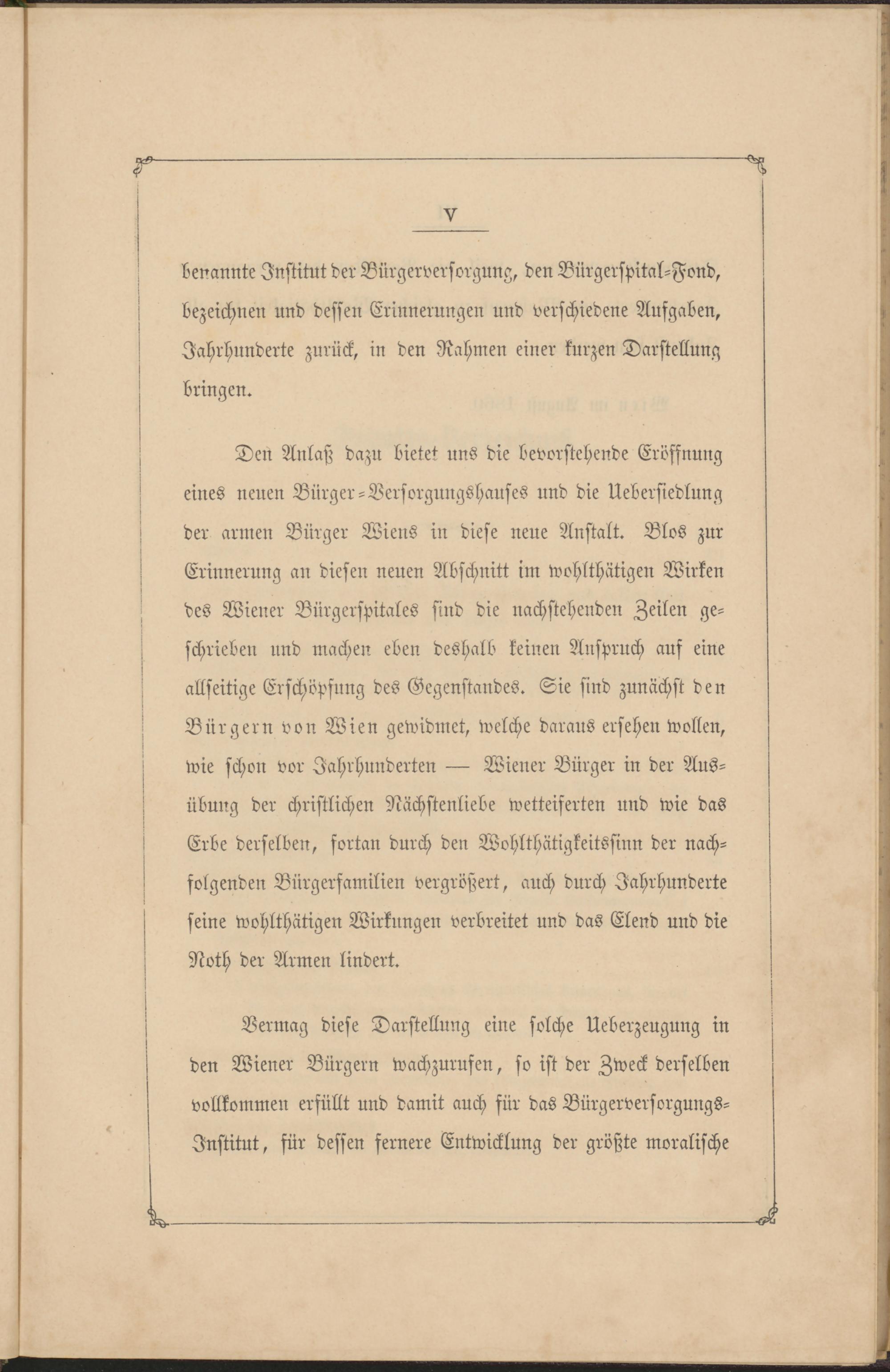 Den Anlaß dazu bietet uns die bevorstehende Eröffnung eines neuen Bürger-Bersorgungshauses und die Uebersiedlung der armen Bürger Wiens in diese neue Anstalt. Blos zur Erinnerung an diesen neuen Abschnitt im wohlthätigen Wirken des Wiener Bürgerspitales sind die nachstehenden Zeilen geschrieben und machen eben deshalb keinen Anspruch auf eine allseitige Erschöpfung des Gegenstandes. Sie sind zunächst den Bürgern von Wien gewidmet, welche daraus ersehen wollen, wie schon vor Jahrhunderten — Wiener Bürger in der Ausübung der christlichen Nächstenliebe wetteiferten und wie das Erbe derselben, fortan durch den Wohlthätigkeitssinn der nachfolgenden Bürgerfamilien vergrößert, auch durch Jahrhunderte seine wohlthätigen Wirkungen verbreitet und das Elend und die Noth der Armen lindert.