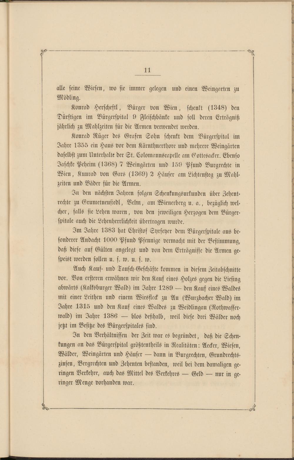 In den nächsten Jahren folgen Schenkungsurkunden über Zchent- rechte zu Grumctncusiedl, Vclm, am Wiencrbcrg u. a., bezüglich welcher , falls sie 2ehen waren, von den jeweiligen Herzogen dem Bürger- spitale auch die Lehcnherrlichkeit übertragen wurde.