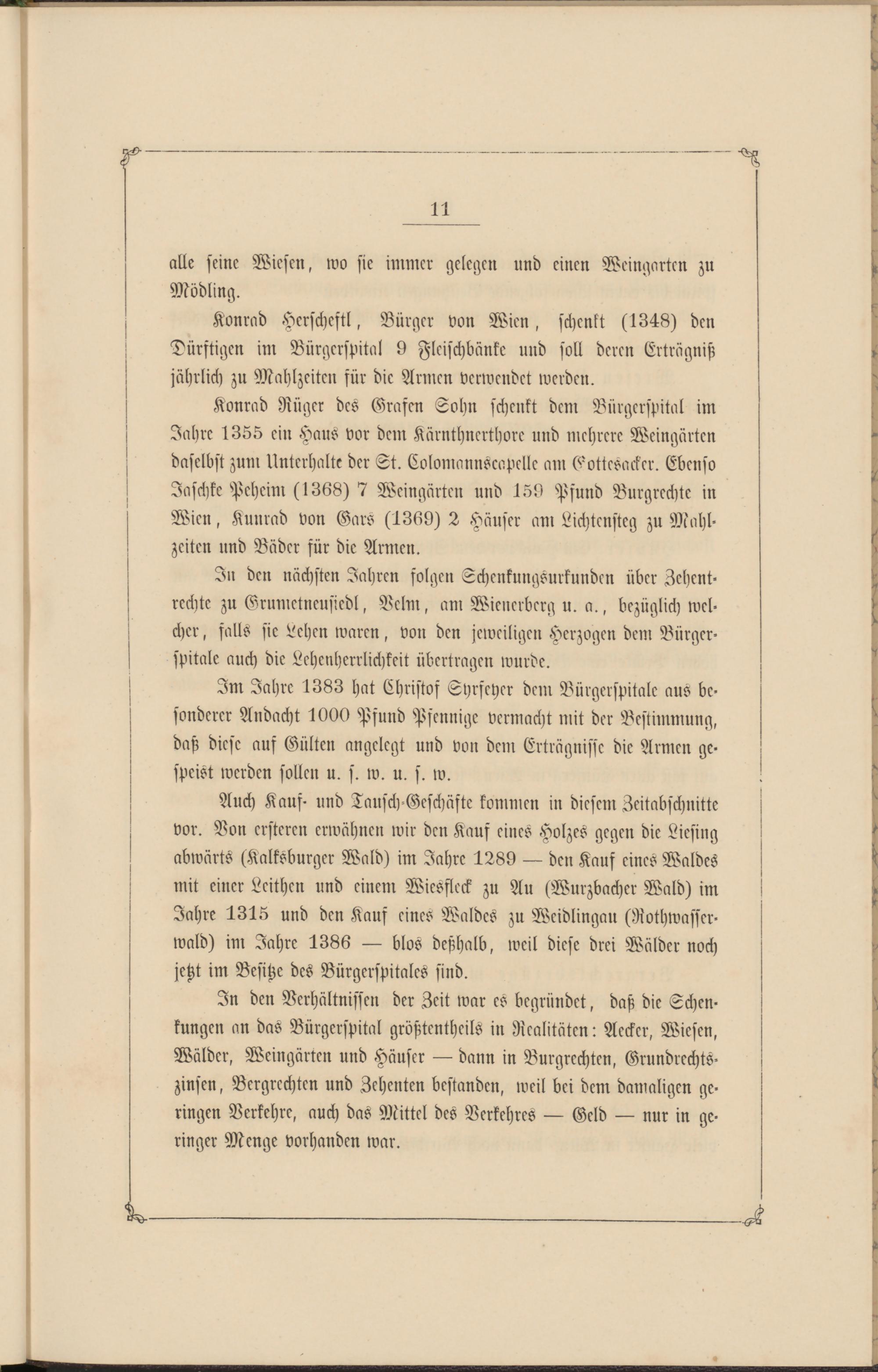 Konrad Hcrscheftl, Bürger von Wien, schenkt (1348) den Dürftigen im Bürgcrspital 9 Fleischbänke und soll deren Erträglich jährlich zu Mahlzeiten sür die Armen verwendet werden.