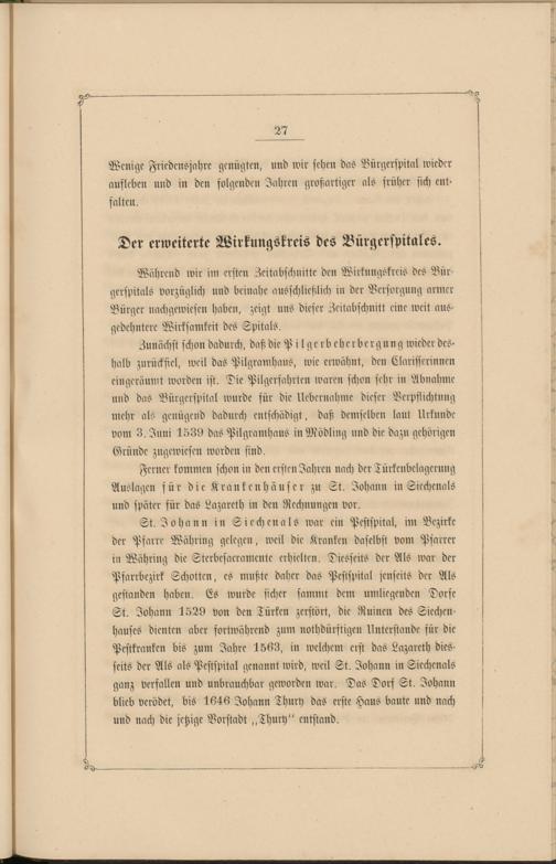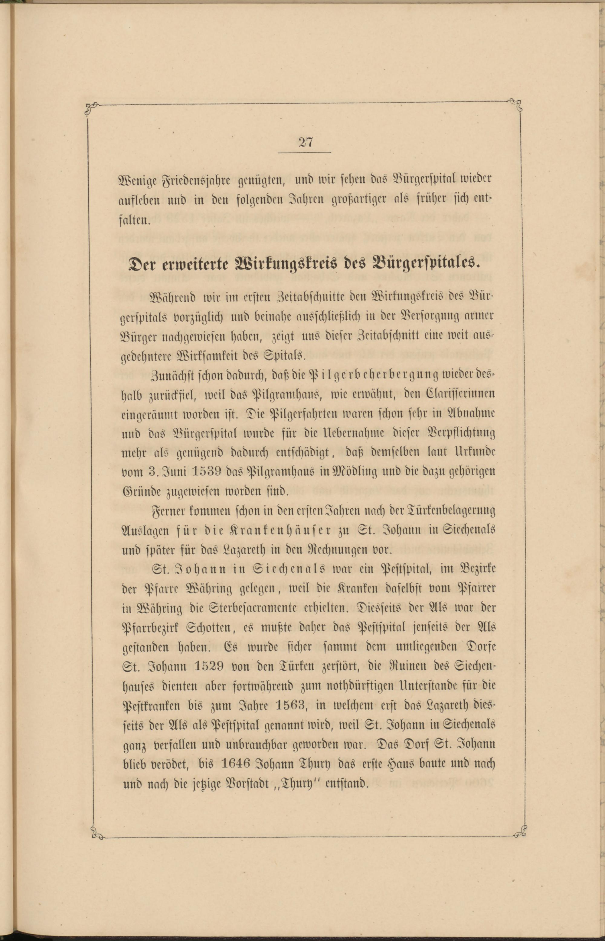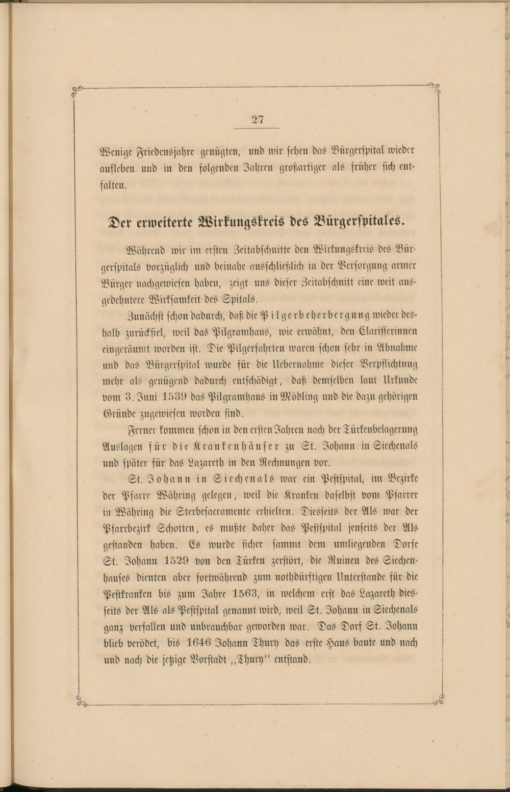 St. Johann in Siechenals war ein Pestspital, im Bezirke der Pfarre Währung gelegen, weil die Kranken daselbst vom Pfarrer in Währung die Sterbesakramente erhielten. Diesseits der Als war der Psarrbezirk Schotten, es mußte daher das Pestspital jenseits der Als gestanden haben. Es wurde sicher sammt dem umliegenden Dorfe St. Johann 1529 von den Türken zerstört, die Ruinen des Siechen- hauses dienten aber fortwährend zum nothdürstigen Unterstände für die Pestkranken bis zum Jahre 1563, in welchem erst das Lazareth diesseits der Als als Pestspital genannt wird, weil St. Johann in Siechenals ganz verfallen und unbrauchbar geworden war. Das Dorf St. Johann blieb verödet, bis 1646 Johann Thury das erste Haus baute und nach und nach die jetzige Vorstadt ,,Thury" entstand.