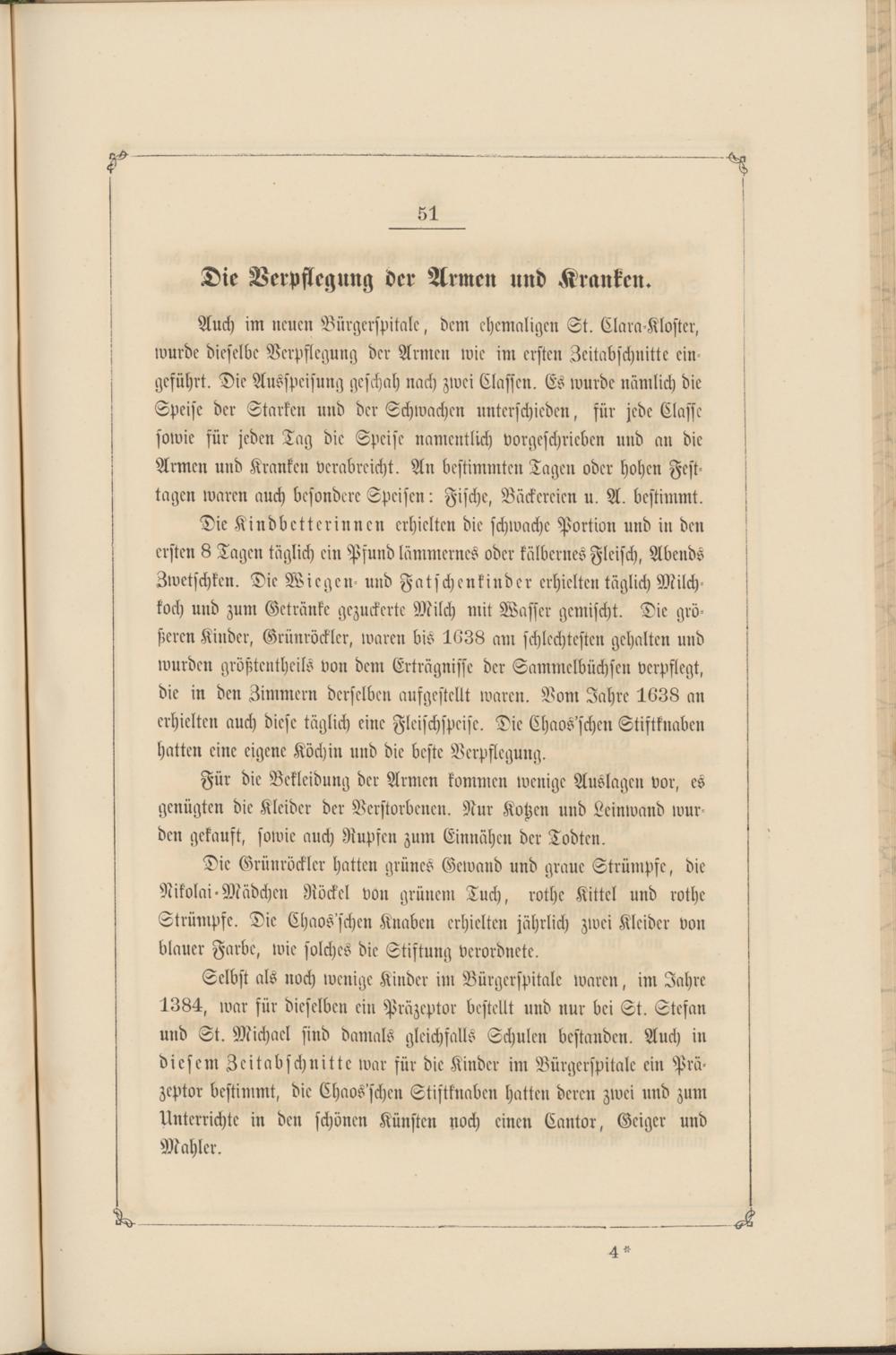 Selbst als noch wenige Kinder im Bürgerspitale waren, im Jahre 1384, war für dieselben ein Präzeptor bestellt und nur bei St. Stefan und St. Michael sind damals gleichfalls Schulen bestanden. Auch in diesem Zeitabschnitte war für die Kinder im Bürgerspitale ein Prä- zeptor bestimmt, die Chaos'schen Stiftknaben hatten deren zwei und zum Unterrichte in den schönen Künsten noch einen Cantor, Geiger und Mahler.
