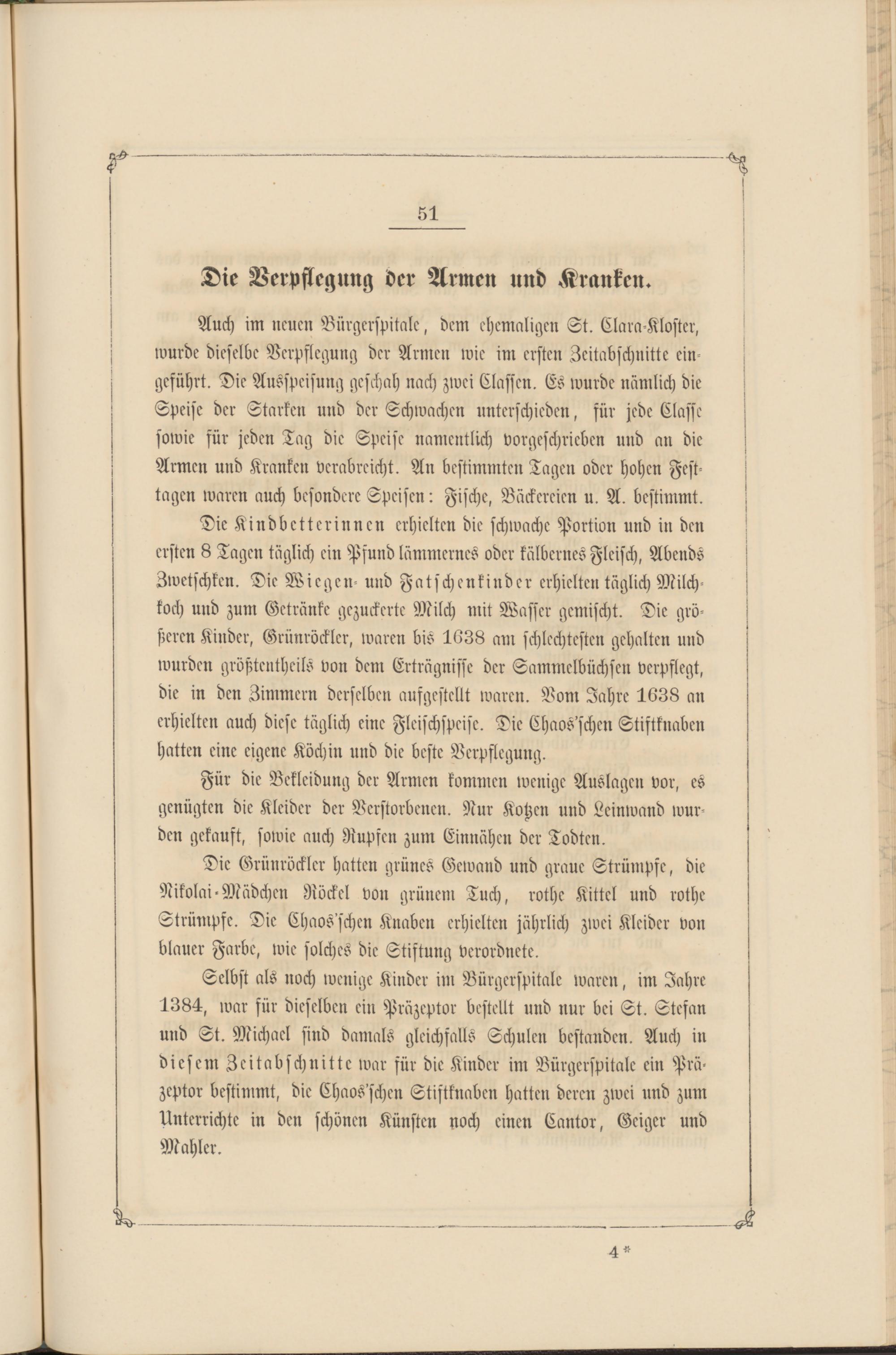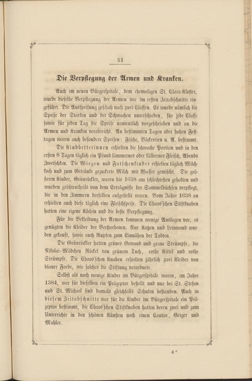 Auch im neuen Bürgerspitale, dem ehemaligen St. Clara-Kloster, wurde dieselbe Verpflegung der Armen wie im ersten Zeitabschnitte eingeführt. Die Ansspeisung geschah nach zwei Classen. Es wurde nämlich die Speise der Starken und der Schwachen unterschieden, für jede Classe sowie für jeden Tag die Speise namentlich vorgeschrieben und an die Armen und Kranken verabreicht. An bestimmten Tagen oder hohen Festtagen waren auch besondere Speisen: Fische, Bäckereien u. A. bestimmt.