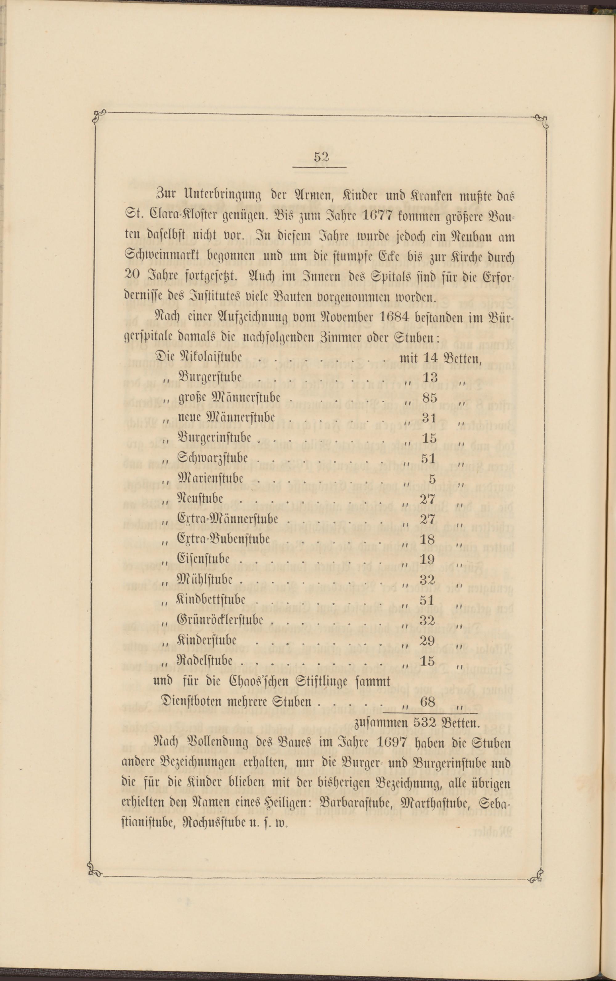 Nach Vollendung des Baues im Jahre 1697 haben die Stuben andere Bezeichnungen erhalten, nur die Bürger- und Bnrgerinstube und die für die Kinder blieben mit der bisherigen Bezeichnung, alle übrigen erhielten den Namen eines Heiligen: Barbarastubc, Marthnstnbe, Seba- stianistube, Rochusstube n. s. w.