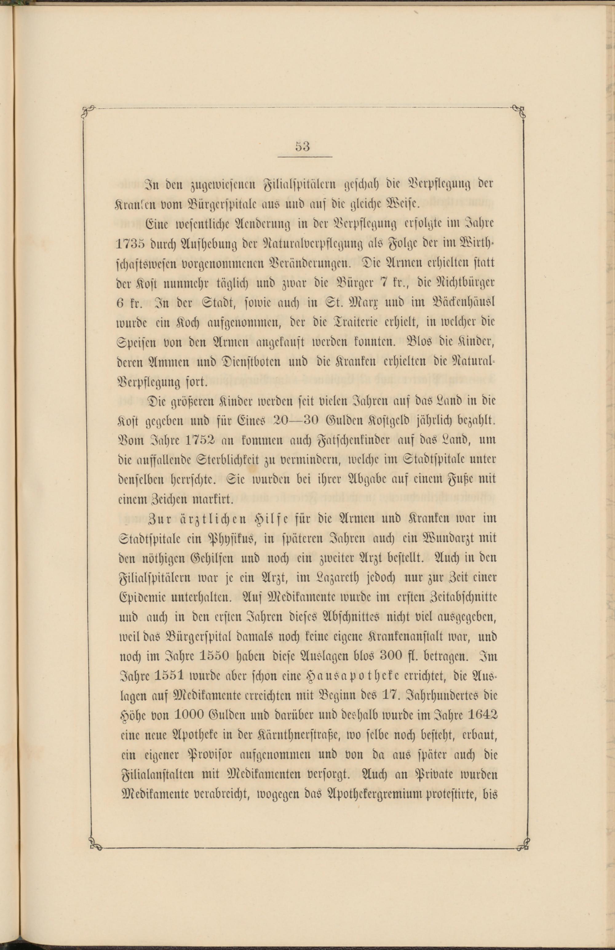 Zur ärztlichen Hilfe für die Armen und Kranken war im Stadtspitale ein Physikus, in späteren Jahren auch ein Wundarzt mit den nöthigen Gehilfen und noch ein zweiter Arzt bestellt. Auch in den Filialspitälcrn war je ein Arzt, im Lazarett) jedoch nur zur Zeit einer Epidemie unterhalten. Aus Medikamente wurde im ersten Zeitabschnitte und auch in den ersten Jahren dieses Abschnittes nicht viel ausgegeben, weil das Bürgerspital damals noch keine eigene Krankenanstalt war, und noch im Jahre 1550 haben diese Auslagen blos 300 fl. betragen. Im Jahre 1551 wurde aber schon eine Hausapotheke errichtet, die Aus- lagen auf Medikamente erreichten mit Beginn des 17. Jnhrhnndertcs die Höhe von 1000 Gulden und darüber und deshalb wurde im Jahre 1642 eine neue Apotheke in der Kärnthncrstraße, wo selbe noch besteht, erbaut, ein eigener Provisor aufgenommen und von da aus später auch die Filialanstaltcn mit Medikamenten versorgt. Auch an Private wurden Medikamente verabreicht, wogegen daS Apothckergremium protestirte, bis