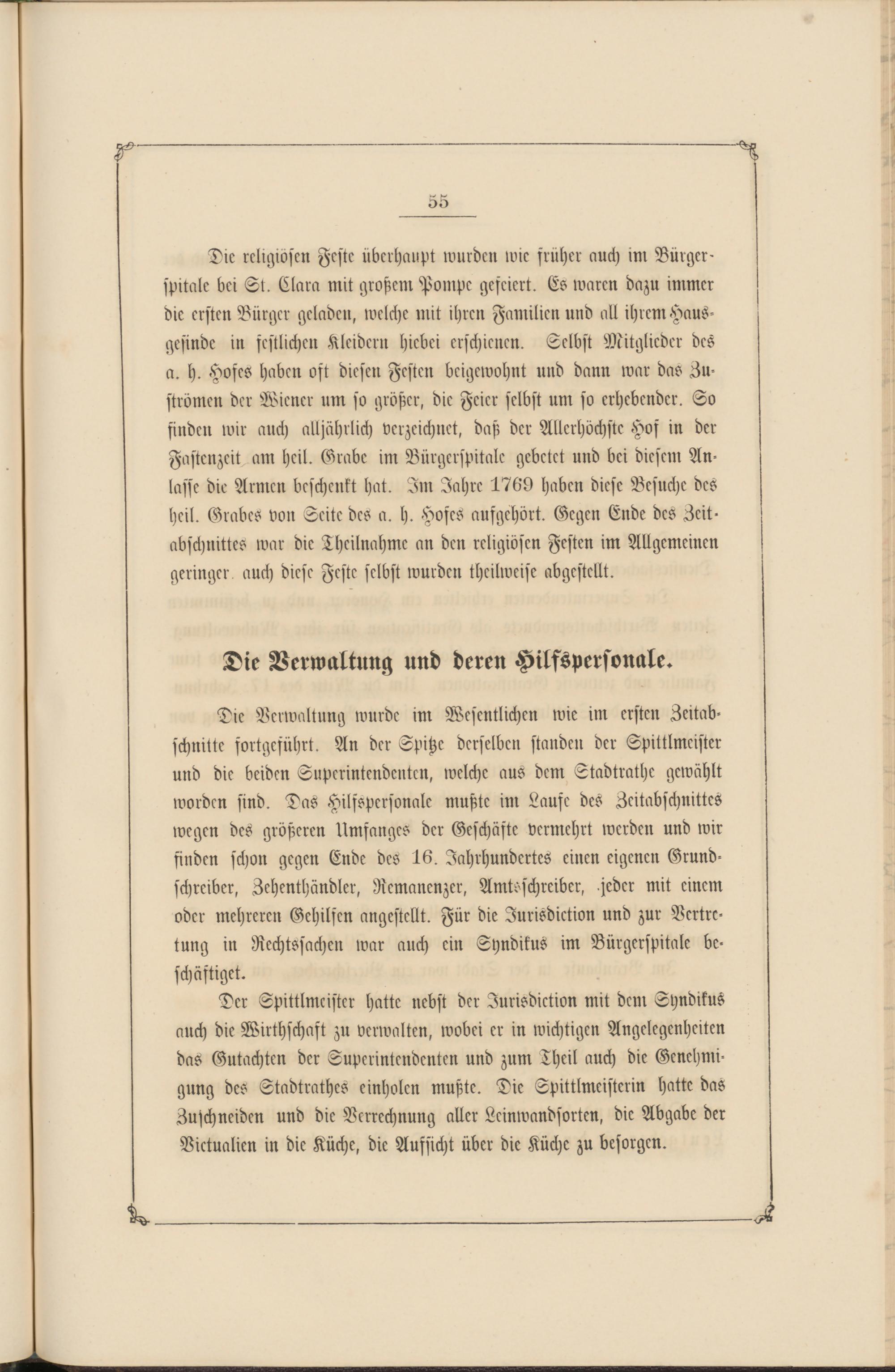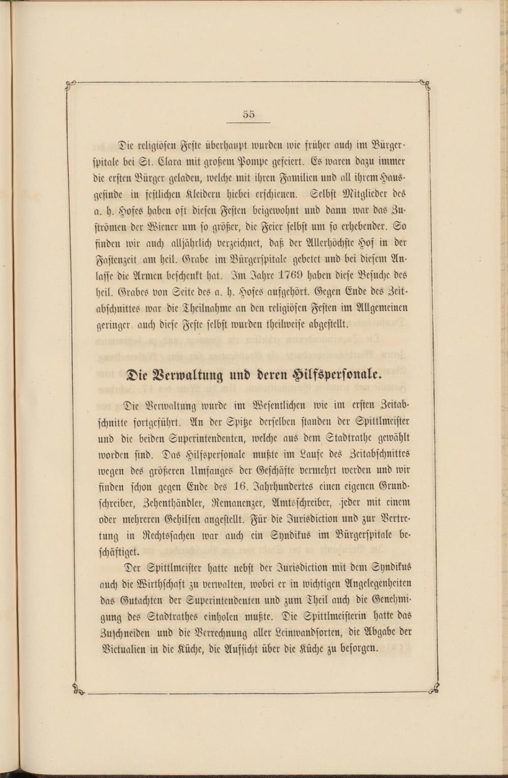 Die Verwaltung wurde im Wesentlichen wie im ersten Zeitabschnitte fortgeführt. An der Spitze derselben standen der Spittlmeister und die beiden Superintendenten, welche aus dem Stadtrathe gewählt worden sind. Das Hilfspersonale mußte im Laufe des Zeitabschnittes wegen des größeren Umfanges der Geschäfte vermehrt werden und wir finden schon gegen Ende des 16. Iahrhundertes einen eigenen Grund- schreiber, Zehenthändler, Remanenzer, Amtsschreiber, jeder mit einem oder mehreren Gehilfen angestellt. Für die Jurisdiktion und zur Vertretung in Rechtssachen war auch ein Syndikus im Bürgerspitale beschäftiget.