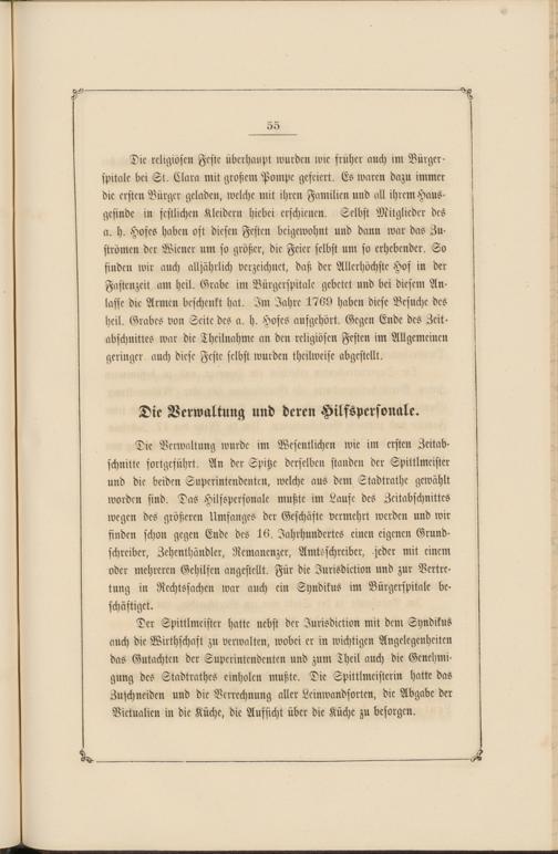 Die religiösen Feste überhaupt wurden wie früher auch im Bürger - spitale bei St. Clara mit großem Pompe gefeiert. Es waren dazu immer die ersten Bürger geladen, welche mit ihren Familien und all ihrem Hausgesinde in festlichen Neidern Hiebei erschienen. Selbst Mitglieder des a. h. Hofes haben oft diesen Festen beigewohnt und dann war das Zuströmen der Wiener um so größer, die Feier selbst um so erhebender. So finden wir auch alljährlich verzeichnet, daß der Allerhöchste Hos in der Fastenzeit am heil. Grabe im Bürgerspitnlc gebetet und bei diesem Anlasse die Armen beschenkt hat. Im Jahre 1769 haben diese Besuche des heil. Grabes von Seite des a. h. HofcS aufgehört. Gegen Ende des Zeitabschnittes war die Theilnahme an den religiösen Festen im Allgemeinen geringer auch diese Feste selbst wurden thcilweise abgestellt.