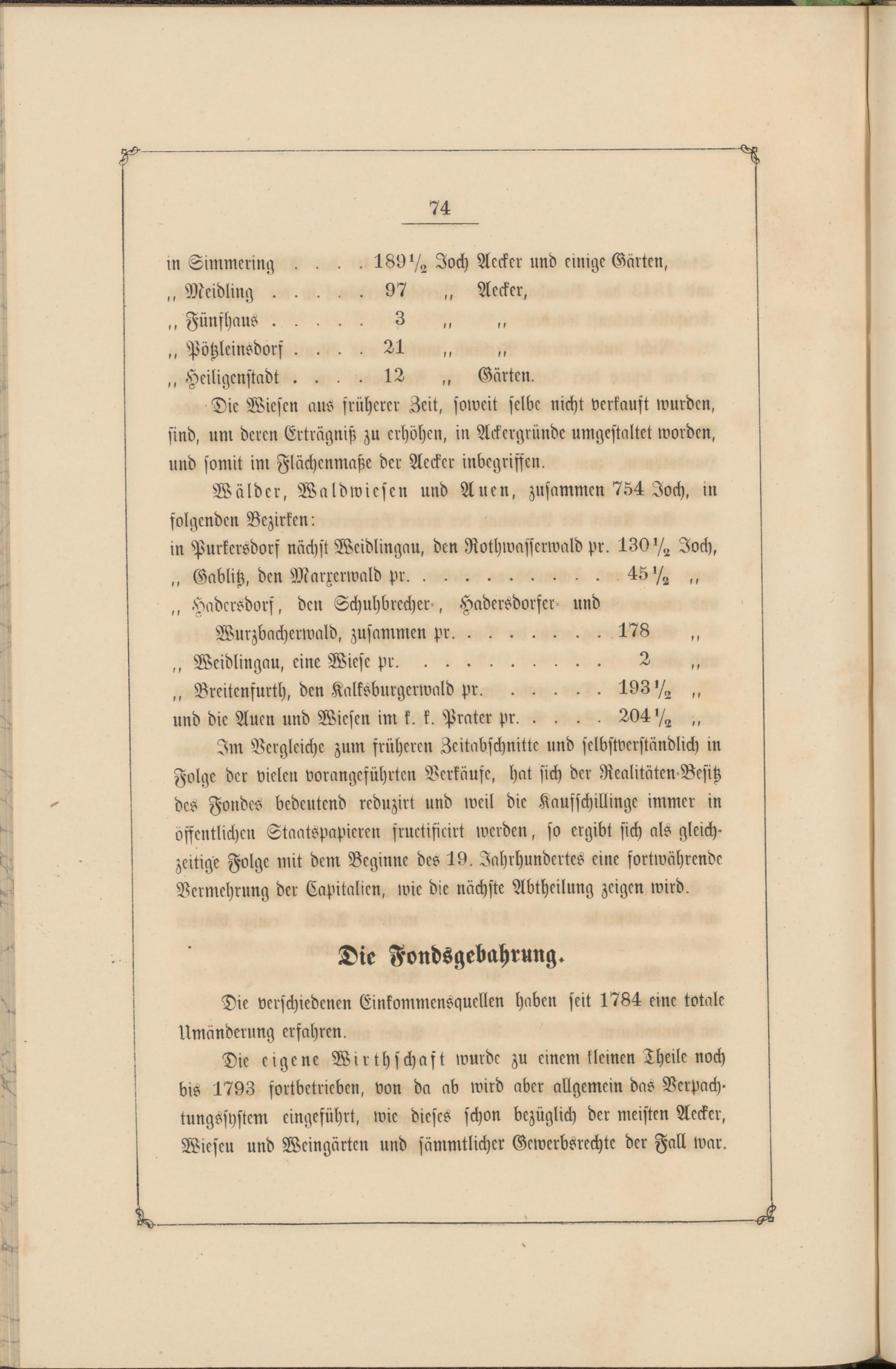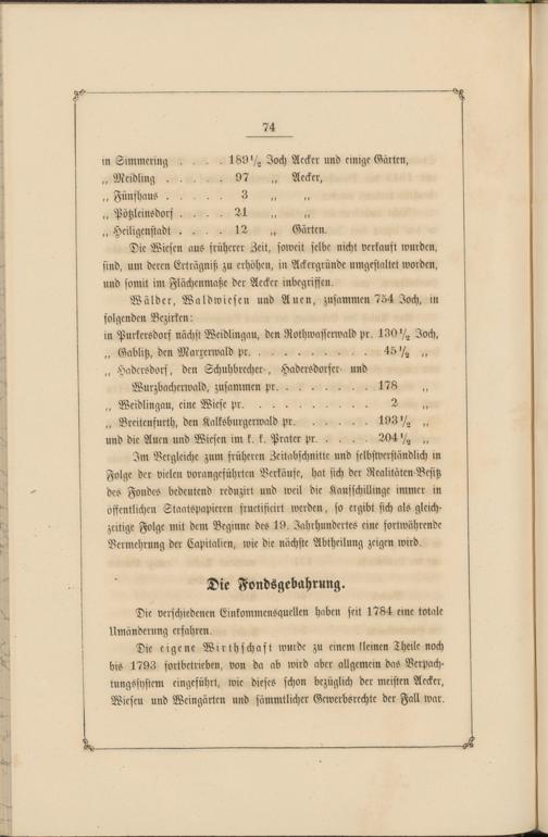 Im Vergleiche zum früheren Zeitabschnitte und selbstverständlich m Folge der vielen vorangeführten Verkäufe, hat sich der Realitäten Besitz des Fondes bedeutend reduzirt und weil die Aausschillinge immer in öffentlichen Staatspapieren fructifieirt werden, so ergibt sich als gleichzeitige Folge mit dem Beginne des 19. JahrhunderteS eine fortwährende Vermehrung der Capitalien, wie die nächste Abtheilung zeigen wird.