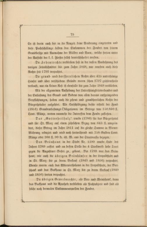 Es ist darin auch bis in die Neuzeit keine Aenderung eingetreten und diese Pachtschillinge bilden das Einkommen des Fondcs von seinem Grundbesitze mit Ausnahme der Wälder und Auen, welche sortan unter der Aussicht der k. k. Förster selbst bewirthschaftet werden.