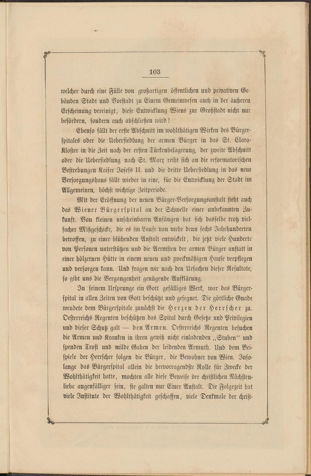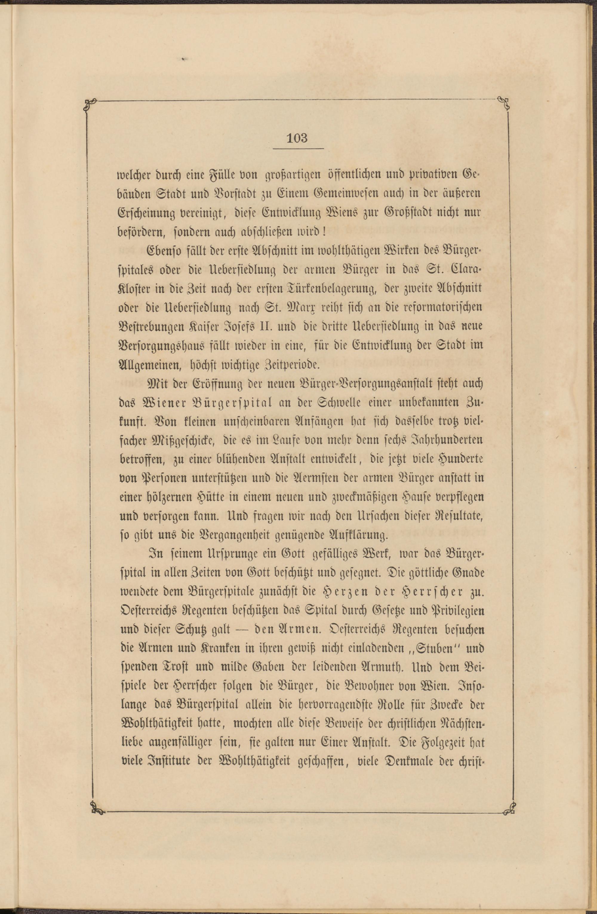 Ebenso fällt der erste Abschnitt im wohlthätigen Wirken des Bürgerspitales oder die Uebersiedlung der armen Bürger in das St. Clara- Kloster in die Zeit nach der ersten Türkenbelagerung, der zweite Abschnitt oder die Uebersiedlung nach St. Marx reiht sich an die resormatorischen Bestrebungen Kaiser Josefs II. und die dritte Uebersiedlung in das neue Versorgungshaus fällt wieder in eine, für die Entwicklung der Stadt im Allgemeinen, höchst wichtige Zeitperiode.