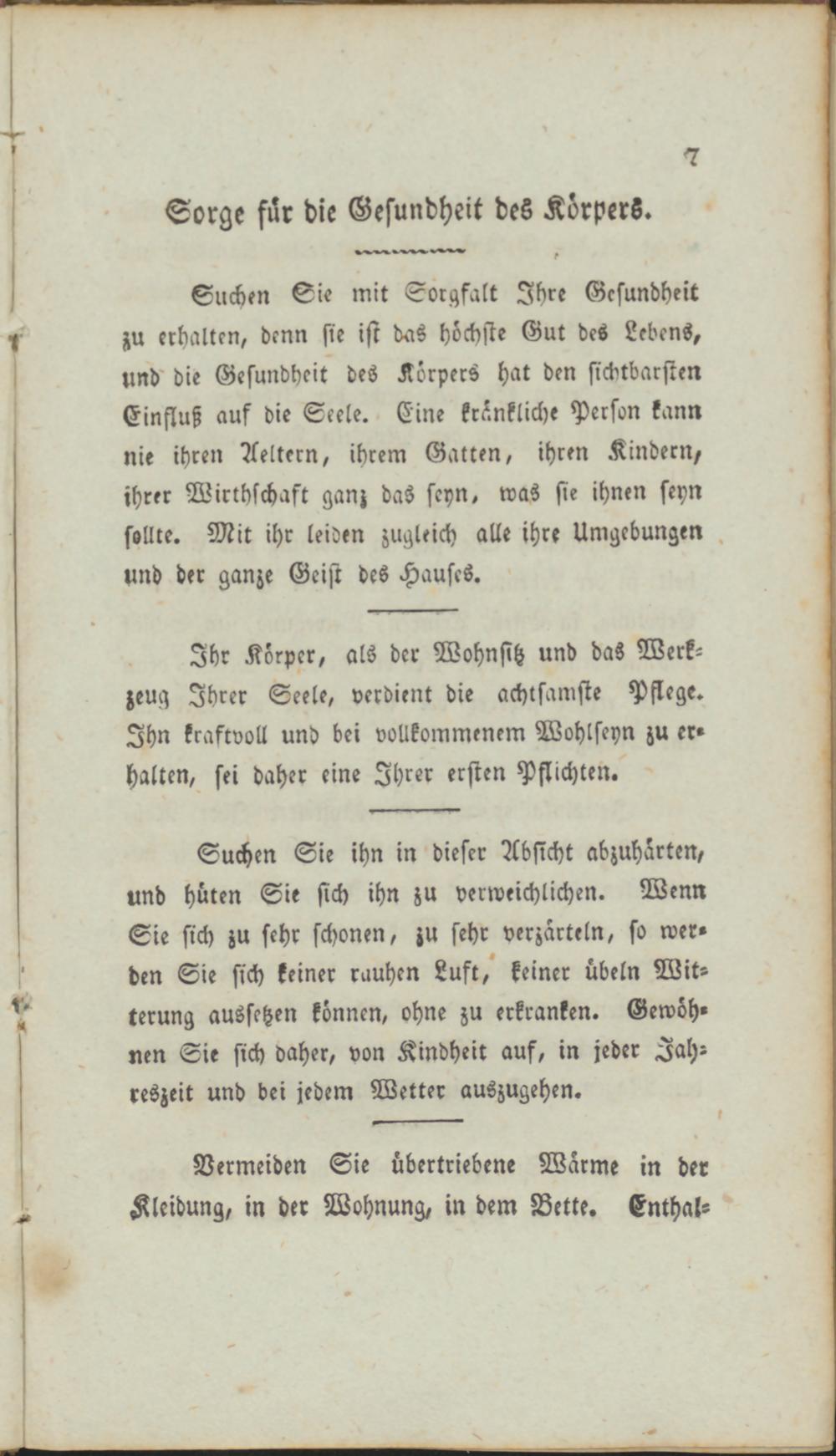 Suchen Sie mit Sorgfalt Ihre Gesundheit zu erhalten, denn sie ist das höchste Gut des Lebens, und' die Gesundheit des Körpers hat den sichtbarsten Einfluß auf die Seele. Eine kränkliche Person kann nie ihren Aeltern, ihrem Gatten, ihren Kindern, ihrer Wirthschaft ganz das seyn, was sie ihnen seyn sollte. Mit ihr leiden zugleich alle ihre Umgebungen und der ganze Geist des Hauses.