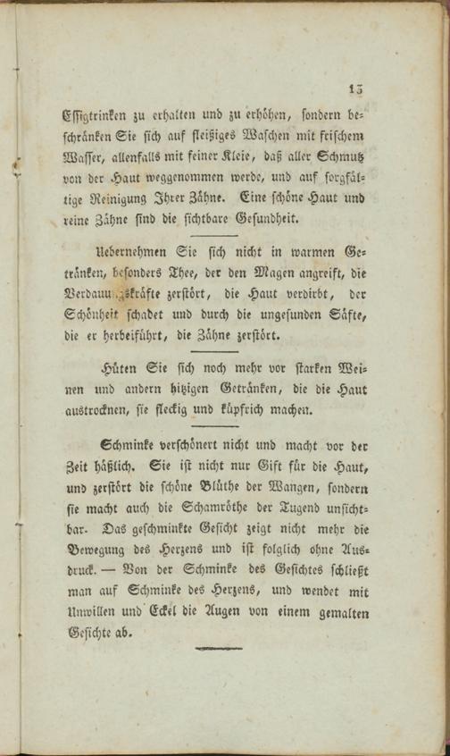 Essigtrinken zu erhalten und zu erhöhen, sondern beschränken Sie sich auf fleißiges Waschen mit frischem Wasser, allenfalls mit feiner Kleie, daß aller Schmutz von der Haut weggenommen werde, und auf sorgfältige Reinigung Ihrer Zahne. Eine schöne Haut und reine Zahne sind die sichtbare Gesundheit.