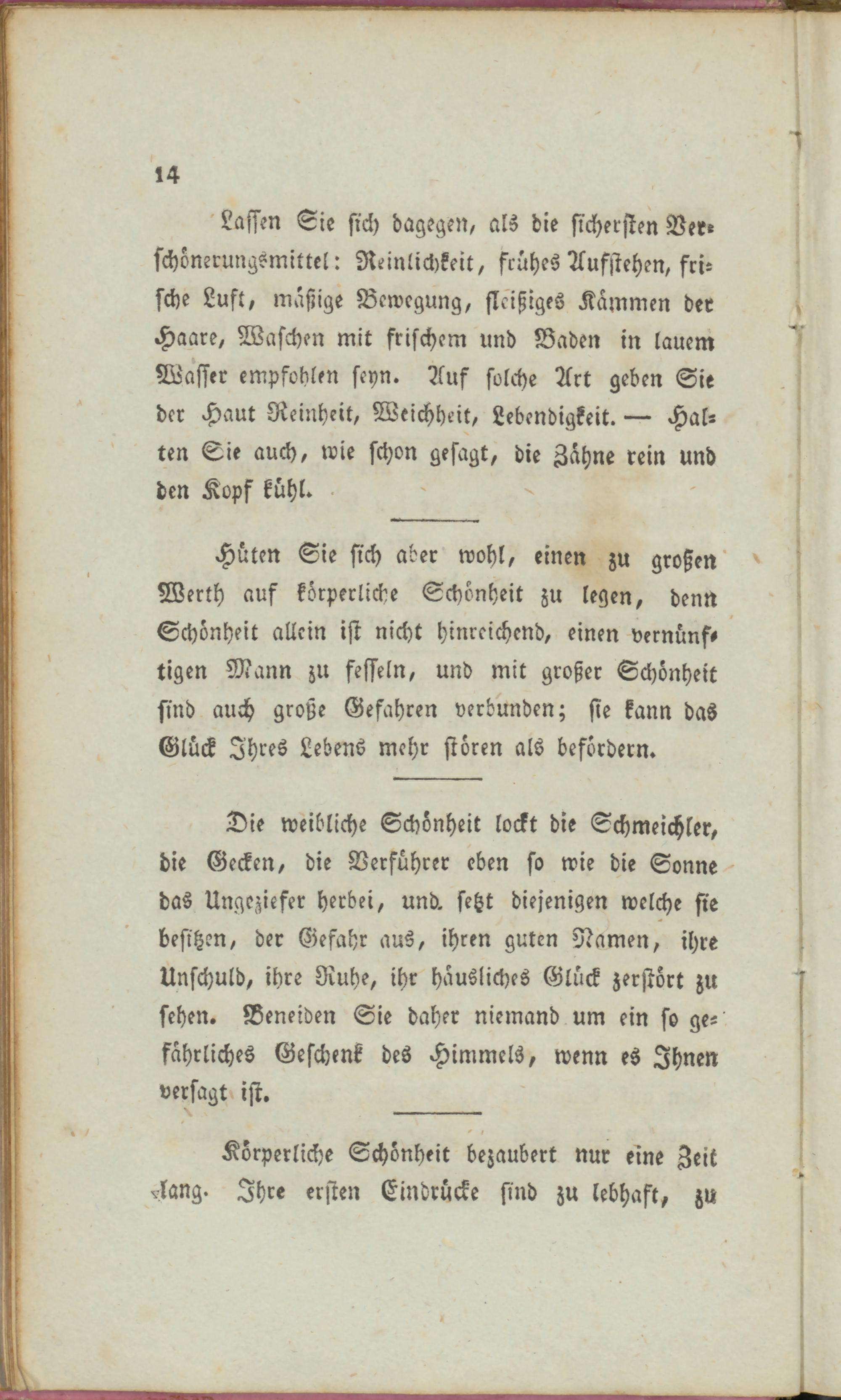 Hüten Sie sich aber wohl, einen zu großen Werth auf körperliche Schönheit zu legen, denn Schönheit allein ist nicht hinreichend, einen vernünf- ! tigen Mann zu fesseln, und mit großer Schönheit sind auch große Gefahren verbunden; sie kann das Glück Ihres Lebens mehr stören als befördern.