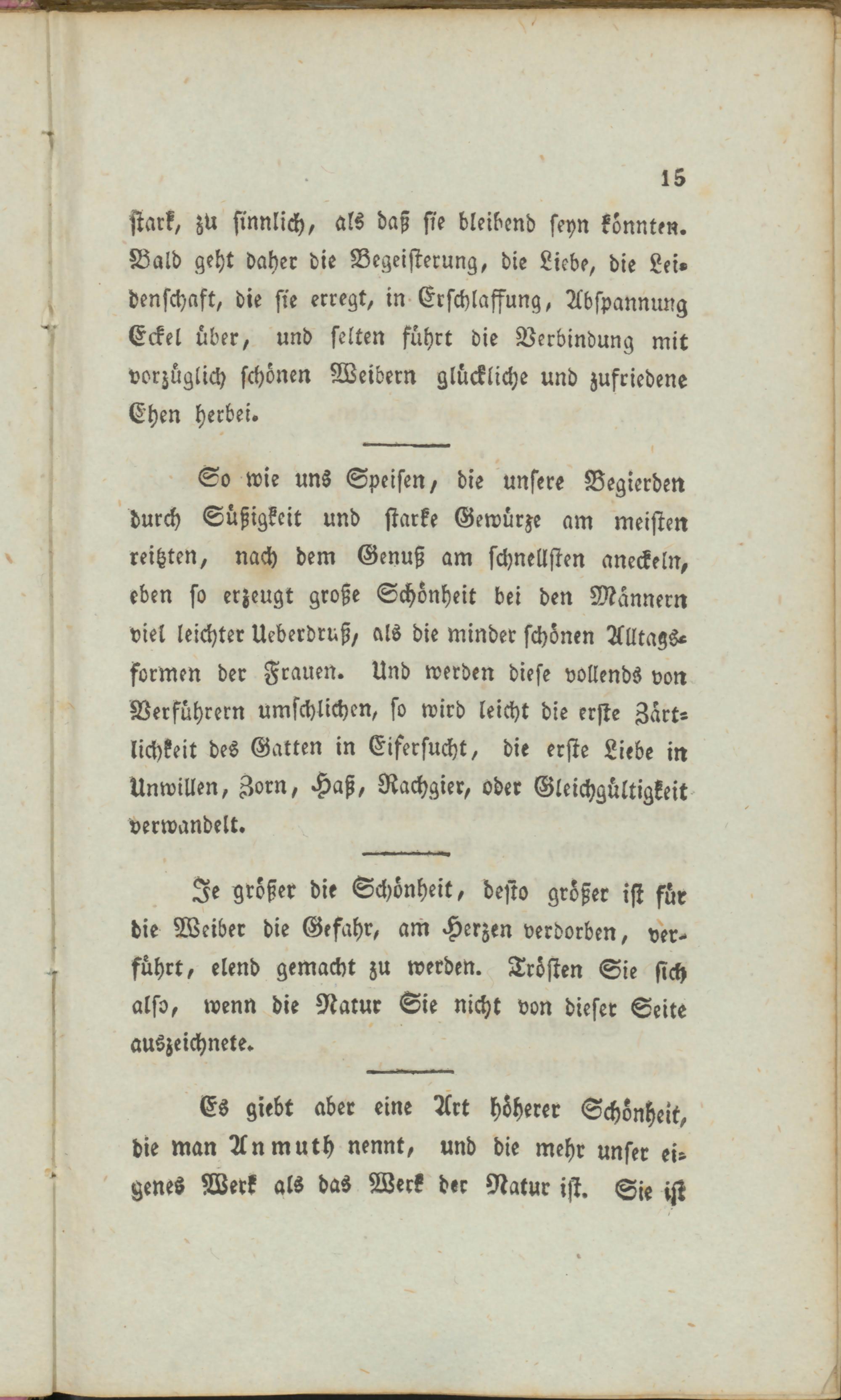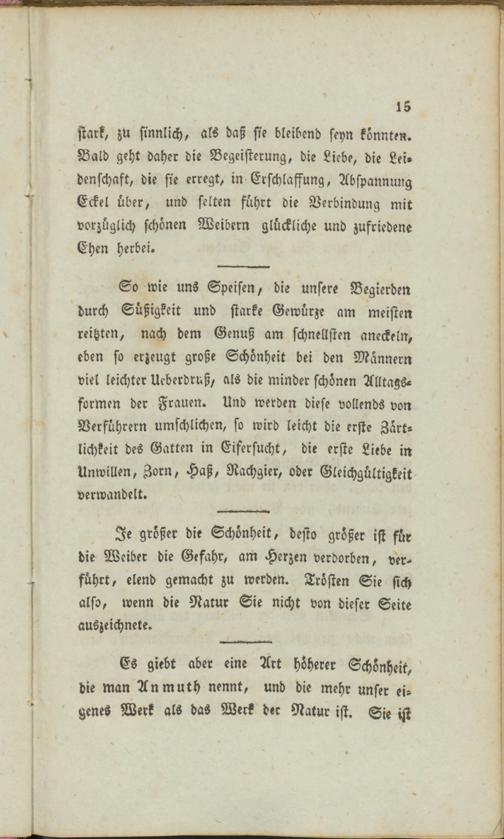 So wie uns Speisen, die unsere Begierden Lurch Süßigkeit und starke Gewürze am meisten reihten, nach dem Genuß am schnellsten aneckeln, eben so erzeugt große Schönheit bei den Männern viel leichter Ueberdruß, als die minder schönen Alltags- formen der Frauen. Und werden diese vollends von Verführern umschlichen, so wird leicht die erste Zärtlichkeit des Gatten in Eifersucht, die erste Liebe in Unwillen, Zorn, Haß, Rachgier, oder Gleichgültigkeit verwandelt.
