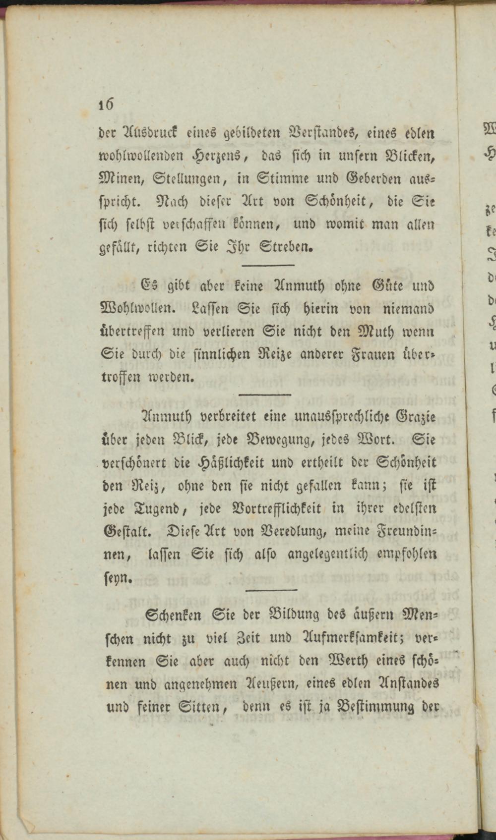 Es gibt aber keine Anmuth ohne Güte und Wohlwollen. Lassen Sie sich hierin von niemand übertreffen und verlieren Sie nicht den Muth wenn Sie durch die sinnlichen Reize anderer Frauen über» troffen werden.