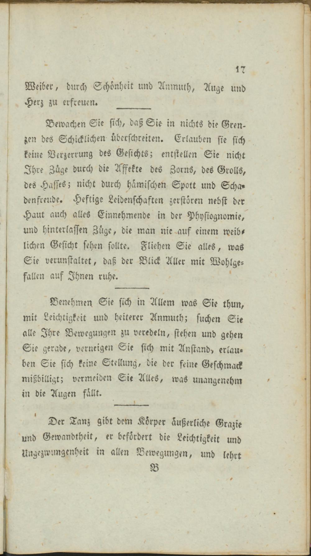 Bewachen Sie sich, daß Sie in nichts die Grenzen des Schicklichen überschreiten. Erlauben sie sich keine Verzerrung des Gesichts; entstellen Sie nicht Ihre Züge durch die Affekte des Zorns, des Grolls, des Haffes; nicht durch hämischen Spott und Scha» densreude. Heftige Leidenschaften zerstören nebst der Haut auch alles Einnehmende in der Physiognomie," und hinterlassen Züge, die man nie auf einem weiblichen Gesicht sehen sollte. Fliehen Sie alles, was Sie verunstaltet, daß der Blick Aller mit Wohlgefallen auf Ihnen ruhe.