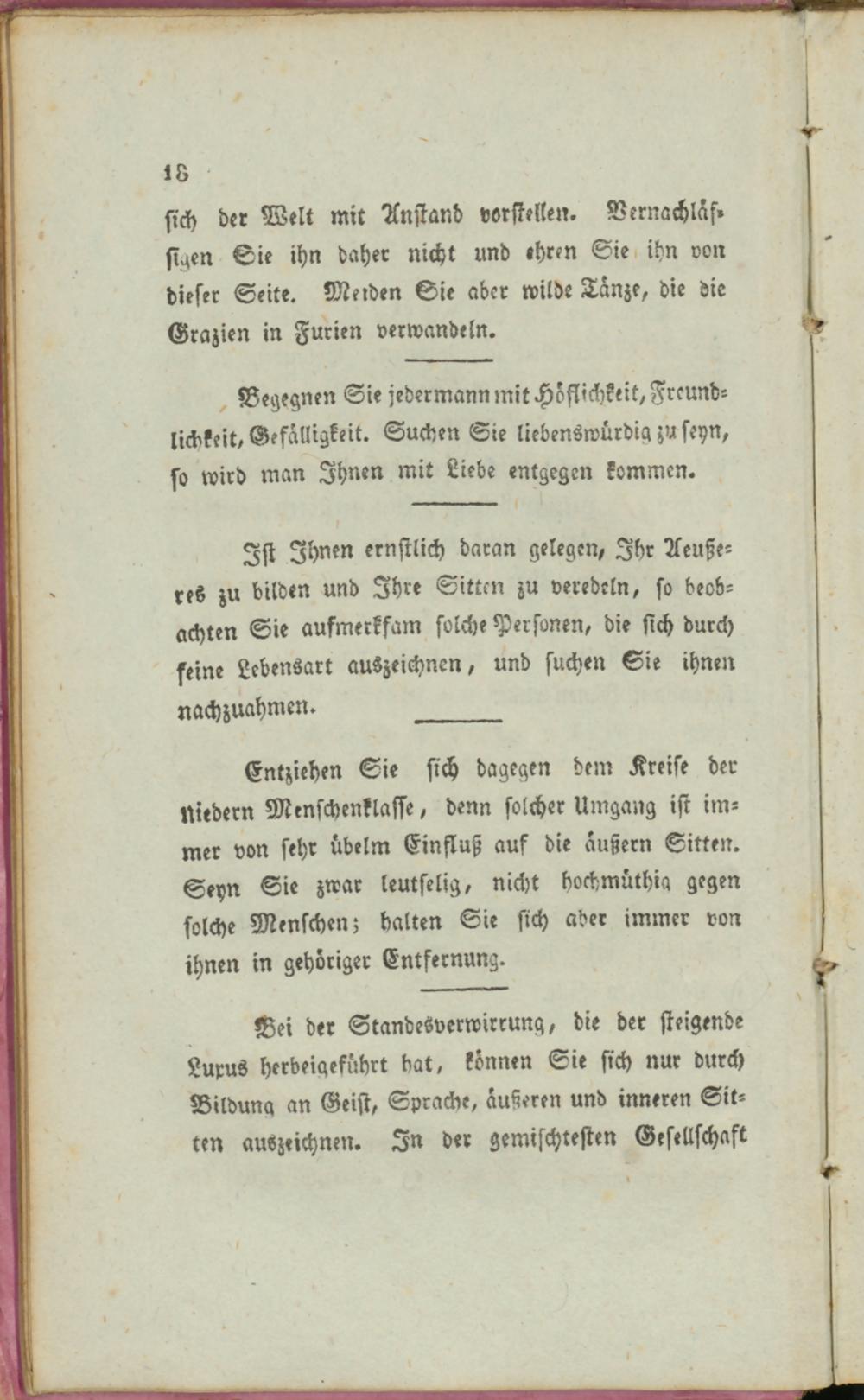 Bei der Standesverwirrunq, die der steigende Luxus herbeigeführt bat, können Sie sich nur durch Bildung an Geist, Sprache, äußeren und inneren Sitten auszeichnen. In der gemischtesten Gesellschaft
