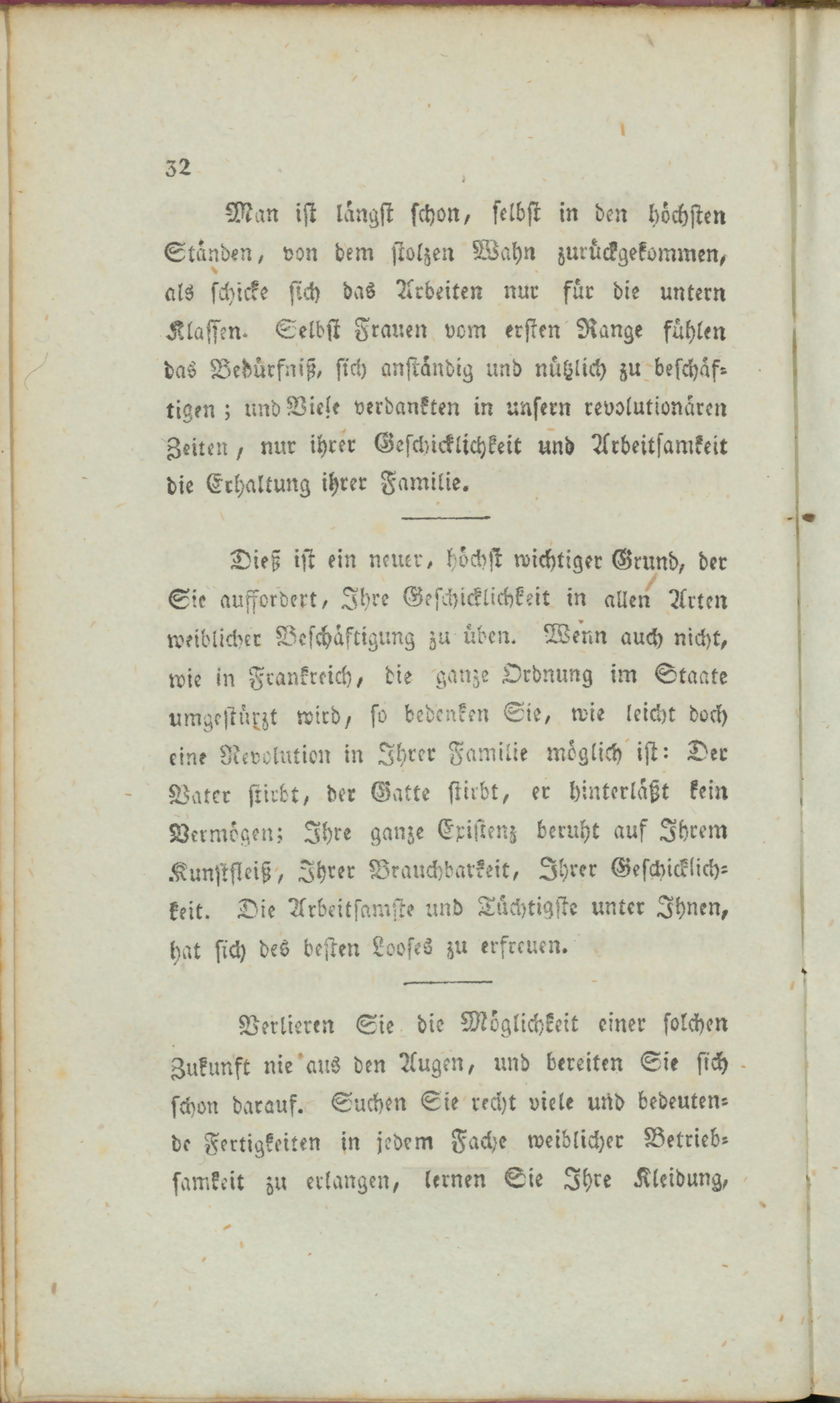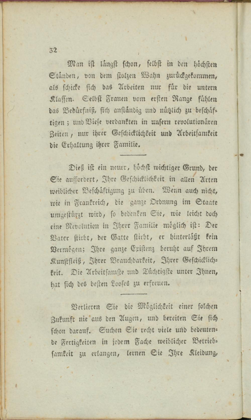 Dieß ist ein neuer, höchst wichtiger Grund, der Sie auffordert, Ihre Gefchicklichkeit in alle/ Arten weiblicher Beschäftigung zu üben. Wenn auch nicht, wie in Frankreich, die ganze Ordnung im Staate umgestürzt wird, so bedenken Sie, wie leicht doch eine Revolution in Ihrer Familie möglich ist: Der Vater stirbt, der Gatte stirbt, er hinterläßt kein Vermögen; Ihre ganze Existenz beruht auf Ihrem Kunstfleiß, Ihrer Brauchbarkeit, Ihrer Geschicklich- keit. Die Arbeitsamste und Tüchtigste unter Ihnen, hat sich des besten Looses zu erfreuen.