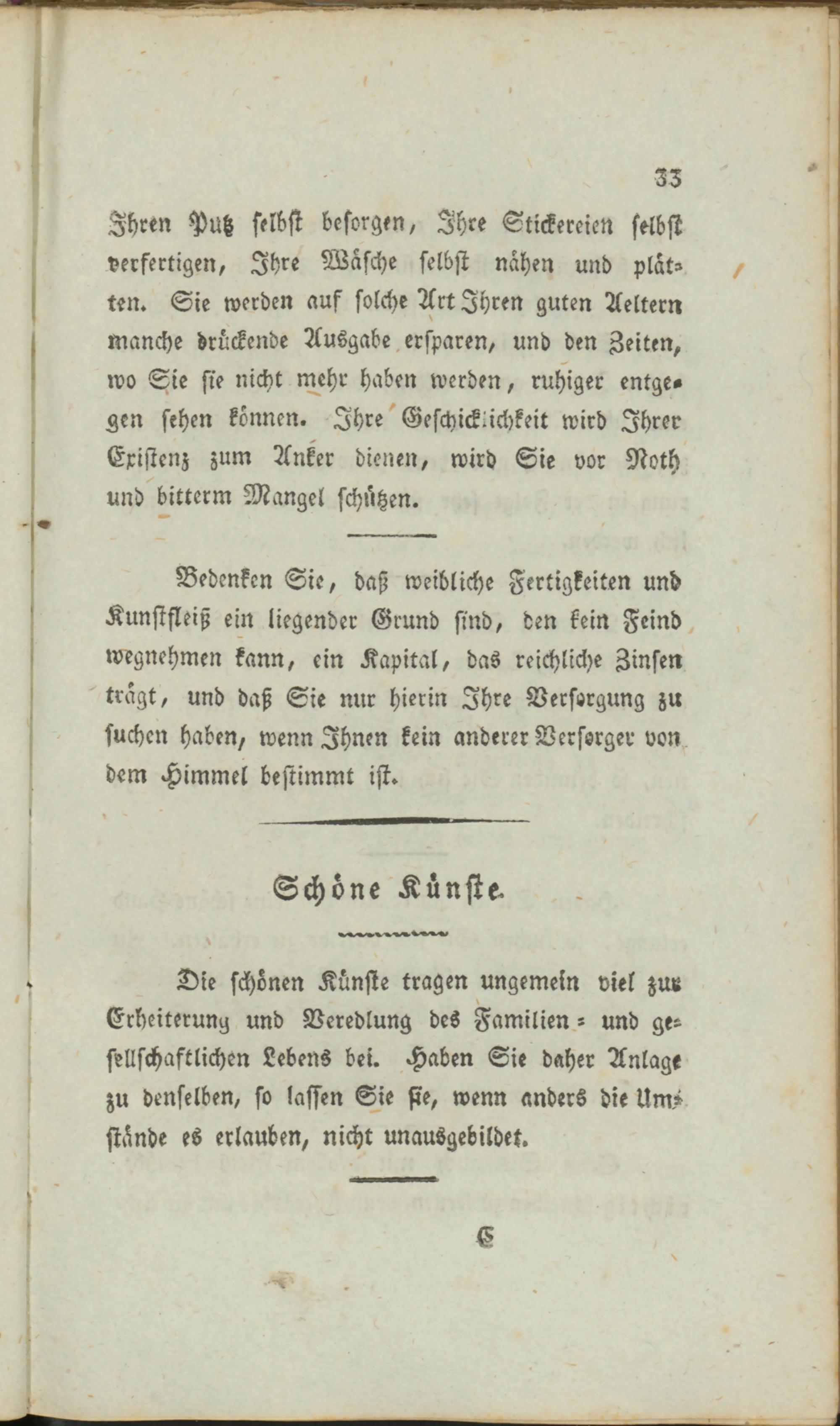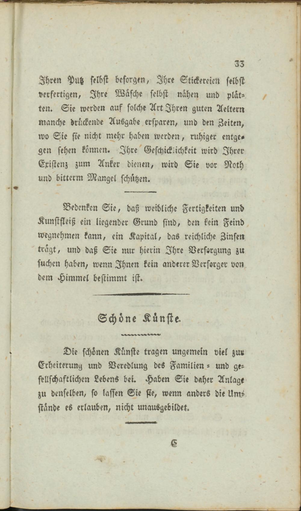 Die schönen Künste tragen ungemekn viel zu« Erheiterung und Veredlung des Familien - und gesellschaftlichen Lebens bei. Haben Sie daher Anlage zu denselben, so lassen Sie fie, wenn anders die Um» stände es erlauben, nicht unausgebildet.