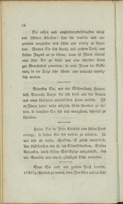 Die ersten und empfehlungswürdigsten Utttek den schönen Künsten: sind die deutlich und angenehm vorzulesen und schön und richtig zu schreiben. Suchen Sie sich hierin, mit großem Fleiß, von früher Jugend an zu bilden, denn ist Ihnen einmal eine üble Art zu lesen und eine schlechte Hand zur Gewohnheit geworden, so wird Ihnen die Besserung in der Folge sehr schwer und vielleicht Unmöglich werdem