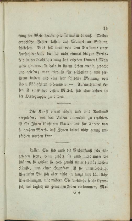 Die Kunst etwas richtig und mit Ausdruck vorzulesen, und das Talent angenehm zu erzählen, ist für Ihren künftigen Gatten und für Andere von so großem Werth, daß Ihnen beides Nicht genug ent- pfohlen werden kann.