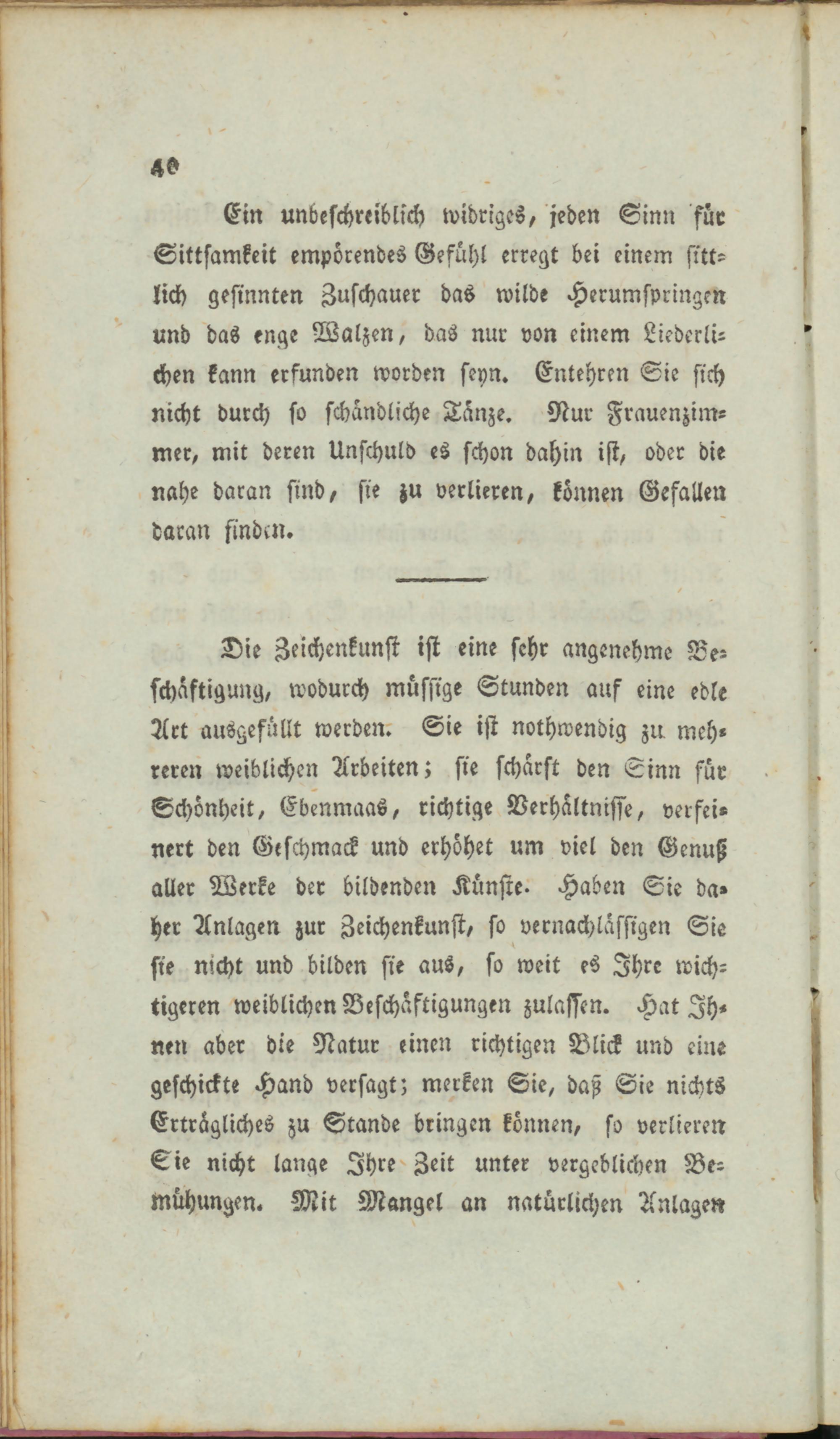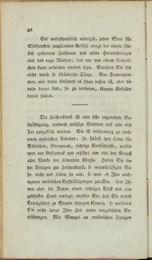 Die Aeichenkunst ist eine sehr angenehme Beschäftigung, wodurch müssi'ge Stunden auf eine edle Art ausgefüllt werden. Sie ist nothwendig zu mehreren weiblichen Arbeiten; sie schärst den Sinn für Schönheit, Ebenmaas, richtige Verhältnisse, verfeinert den Geschmack und erhöhet um viel den Genuß aller Werke der bildenden Künste. Haben Sie daher Anlagen zur Zeichenkunst, so vernachlässigen Sie sie nicht und bilden sie aus, so weit es Ihre wichtigeren weiblichen Beschäftigungen zulassen. Hat Ihnen aber die Natur einen richtigen Blick und eine geschickte Hand versagt; merken Sie, daß Sie nichts Erträgliches zu Stande bringen können, so verlieren Cie nicht lange Ihre Zeit unter vergeblichen Bemühungen. Mit Mangel an natürlichen Anlagen