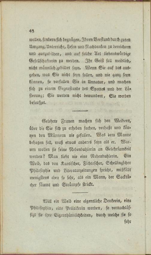 Gelehrte Frauen machen sich den Weibern, über die Sie sich zu erheben suchen, verhaßt und kön» nen den Männern nie gefallen. Was dem Manne behagen soll, muß etwas anderes seyn als er. Warum wollen sie seine Nebenbuhlerin an Gelehrsamkeit werden? Man liebt nie eine Nebenbuhlerin. Ein Weib, das von Kantischer, Fichtescher, Schellingschec Philosophie und Litrraturzeitungen spricht, mißfällt wenigstens eben so sehr, als ein Mann, der Sacktü- -/ eher säumt und Strümpfe strickt.