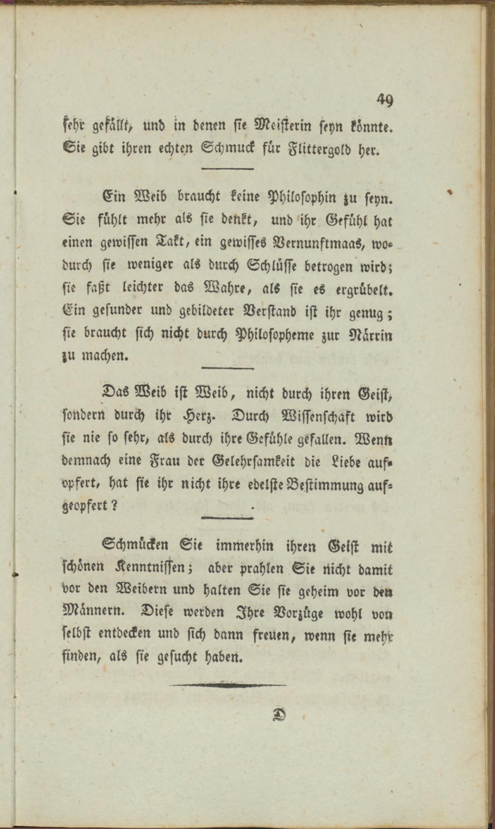 Ein Weib braucht keine Philosophin zu seyn. Sie fühlt mehr als sie denkt, und 'ihr Gefühl hat einen gewissen Takt, ein gewisses Vernunftmaas, wodurch sie weniger als durch Schlüsse betrogen wird» sie faßt leichter das Wahre, als sie es ergrübelt. Ein gesunder und gebildeter Verstand ist ihr genug; sie braucht sich nicht durch Philosopheme zur Närrin zu machen.