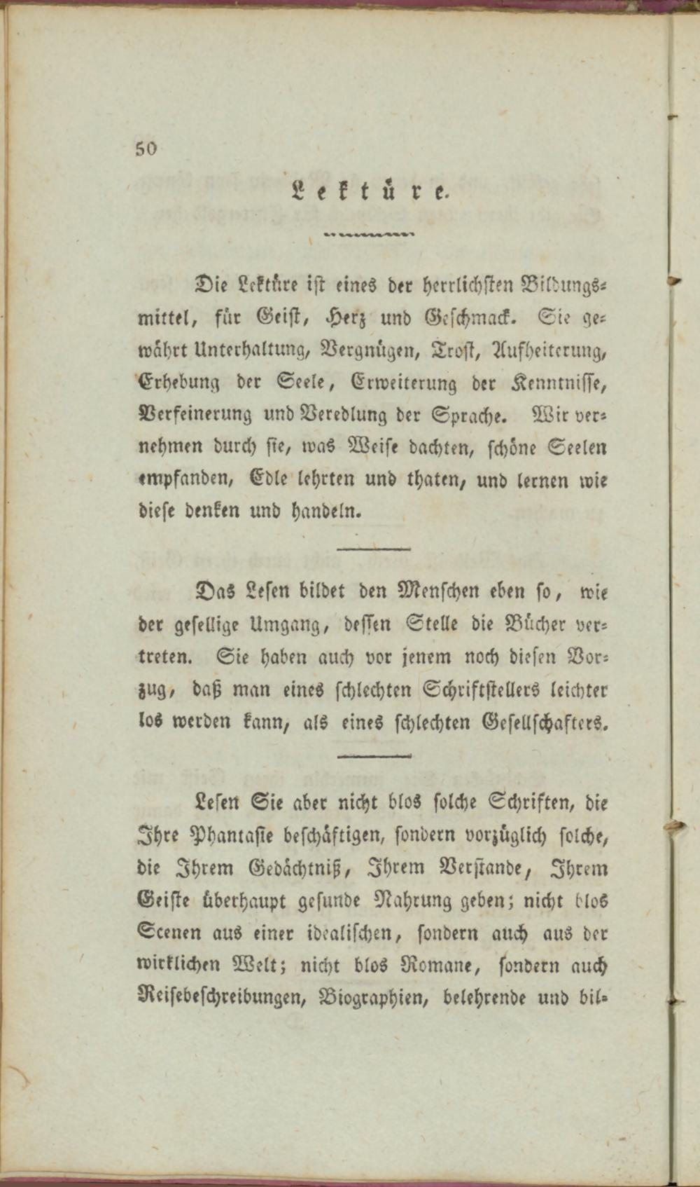 Die Lektüre ist eines der herrlichsten Bildungs- mittel, für Geist, Herz und Geschmack. Sie gewahrt Unterhaltung, Vergnügen, Trost, Aufheiterung, Erhebung der Seele, Erweiterung der Kenntnisse, Verfeinerung und Veredlung der Sprache. Wir vernehmen durch sie, was Weife dachten, schöne Seelen empfanden, Edle lehrten und thaten, und lernen wie diese denken und handeln.