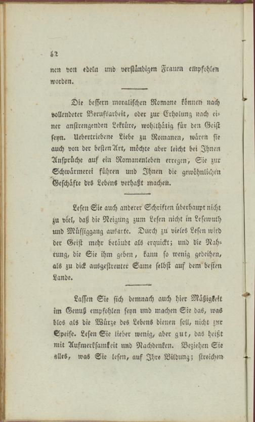Die bessern moralischen Romane können nach vollendeter Berufsarbeit, oder zur Erholung nach einer anstrengenden Lektüre, wohlthätig für den Geist seyn. Übertriebene Liebe zu Romanen, waren sie auch von der besten Art, möchte aber leicht bei Ihnen Ansprüche auf ein Romanenleben erregen, Sie zur Schwärmerei führen und Ihnen die gewöhnlichen Geschäfte des Lebens verhaßt machen.