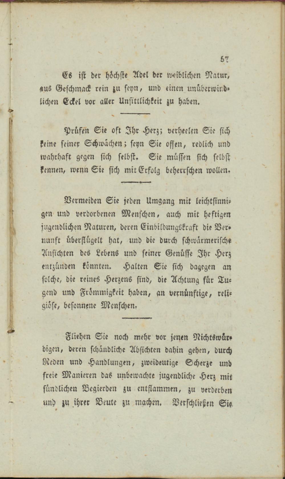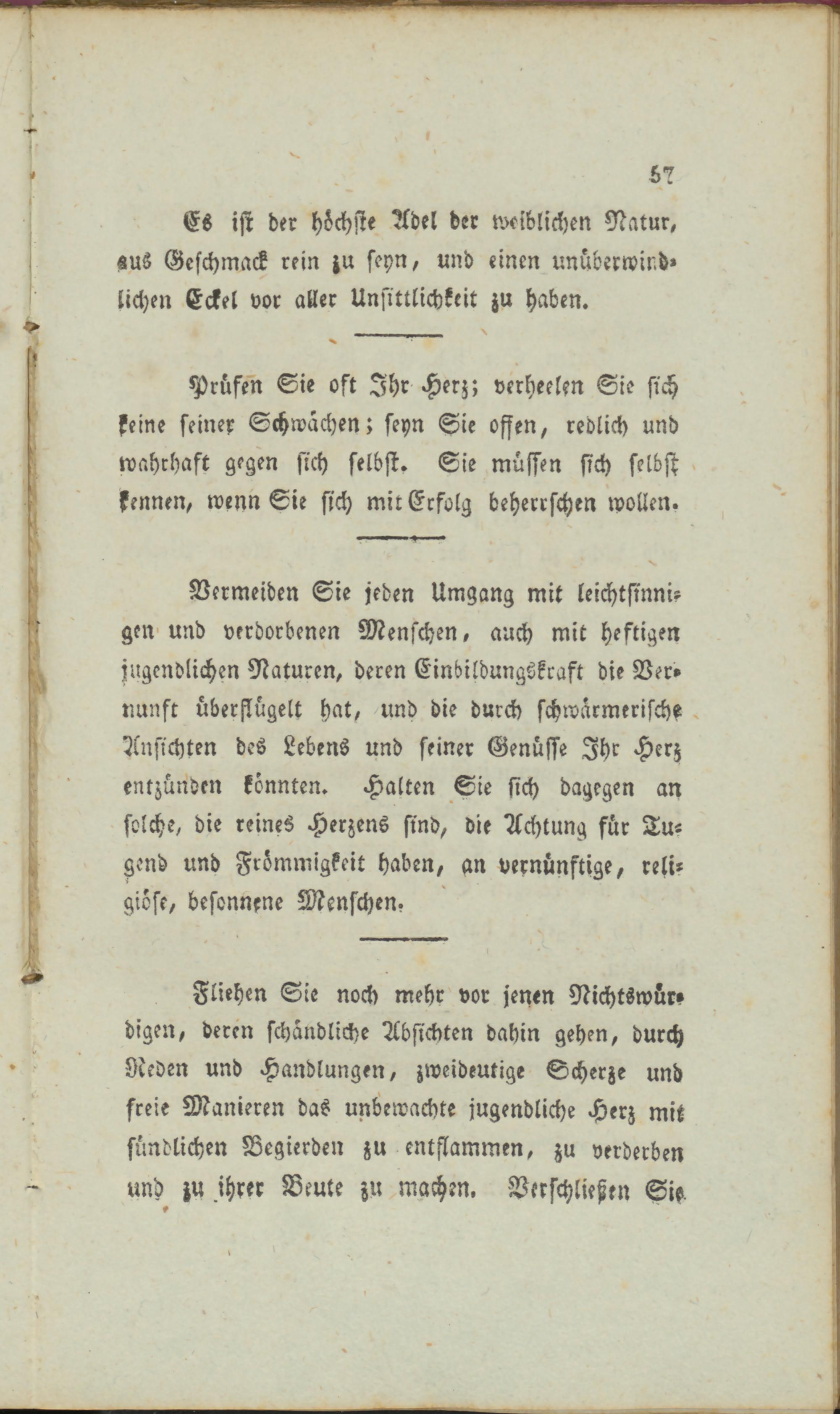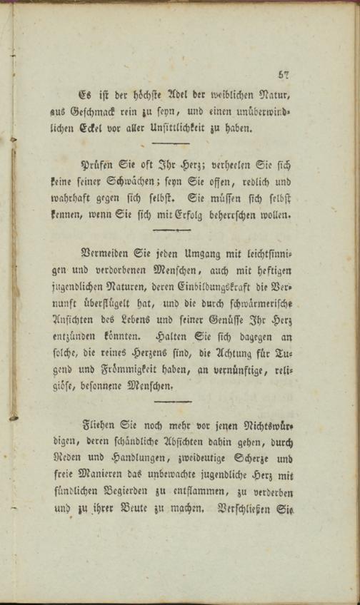 Vermeiden Sie jeden Umgang mit leichtsinnigen und verdorbenen Menschen, auch mit heftigen jugendlichen Naturen, deren Einbildungskraft die Ver» nunft überflügelt hat, und die durch schwärmerische Ansichten des Lebens und seiner Genüsse Ihr Herz entzünden könnten. Halten Sie sich dagegen an solche, die reines Herzens sind, die Achtung für Tugend und Frömmigkeit haben, an vernünftige, religiöse, besonnene Menschen.