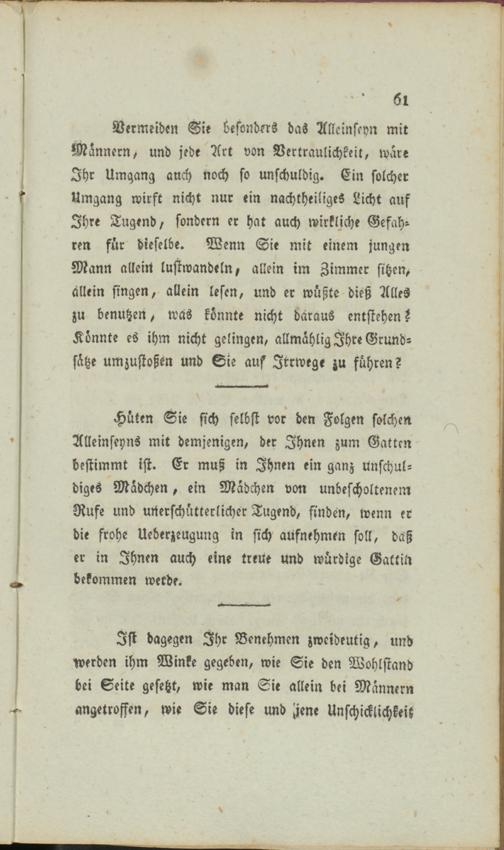 Vermeiden Sir besonders das Alleinstyn mit Männern, und jede Art von Vertraulichkeit, wäre Ihr Umgang auch noch so unschuldig. Ein solcher Umgang wirft nicht nur ein nachtheiliges Licht auf Ihre Tugend, sondern er hat auch wirkliche Gefahren für dieselbe. Wenn Sie mit einem jungen Mann allein lustwandeln, allein im Zimmer sitzen, allein singen, allein lesen, und er wüßte dieß Alles zu benutzen, was könnte nicht daraus entstehen? Könnte es ihm nicht gelingen, allmählig Ihre Grundsätze umzustoßen und Sie auf Irrwege zu führen?