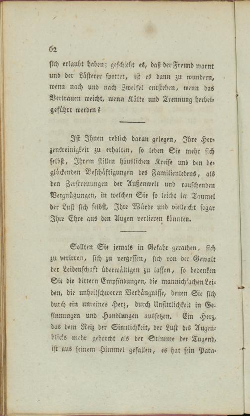 Ist Ihnen redlich daran gelegen, Ihre Her- zenöreinigkeit zu erhalten, so leben Sie mehr sich selbst, Ihrem stillen häuslichen Kreise und den beglückenden Beschäftigungen des Familienlebens, als den Zerstreuungen der Außenwelt und rauschenden Vergnügungen, in welchen Sie so leicht im Taumel der Lust sich selbst, Ihre Würde und vielleicht sogar Ihre Ehre aus den Augen verlieren könnten.