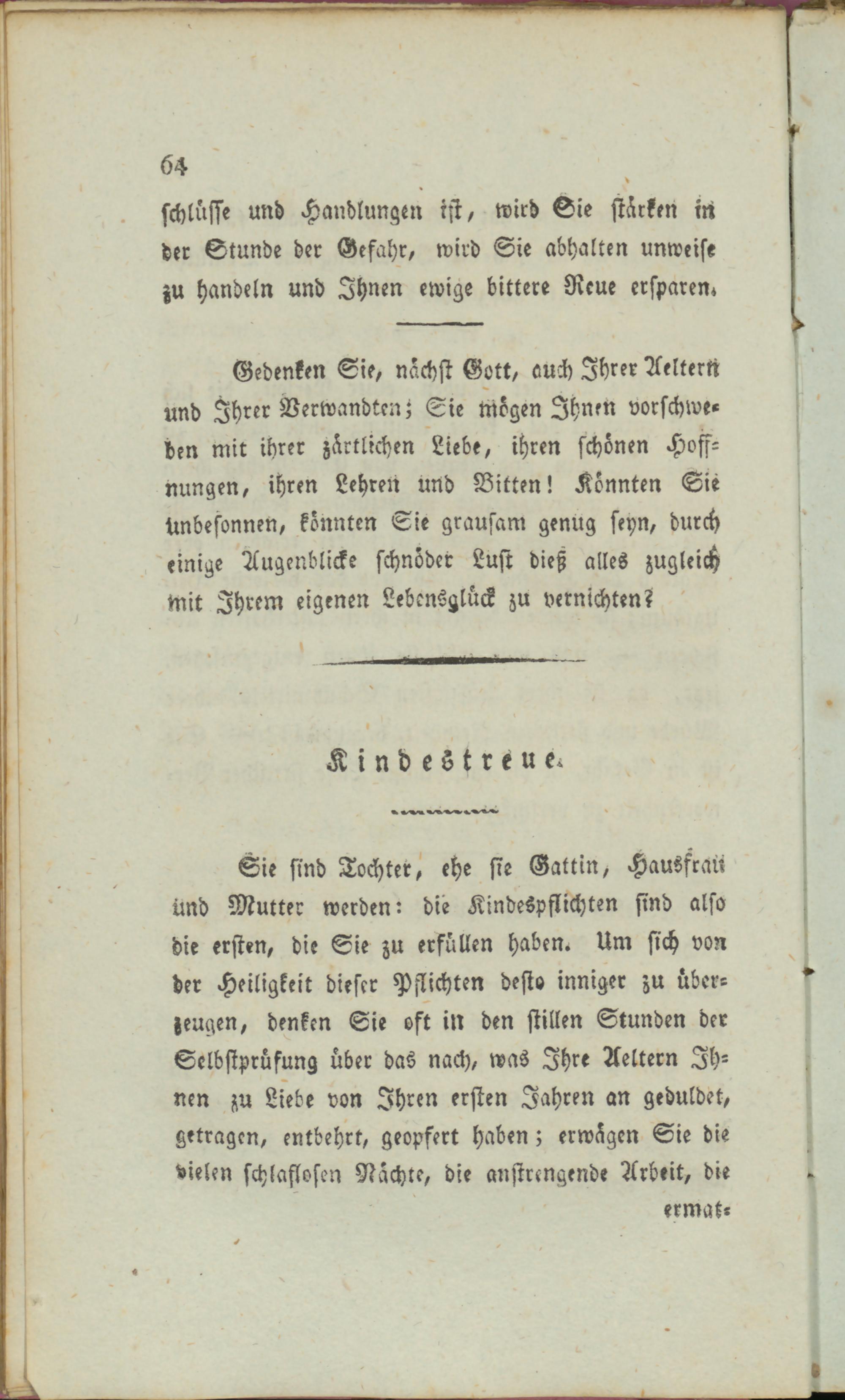 Sie sind Tochter, ehe sie Gattin, Hausfrau und Mutter werden: die Kindespflichten sind also die ersten, die Sie zu erfüllen haben. Um sich von der Heiligkeit dieser Pflichten desto inniger zu überzeugen, denken Sie oft in den stillen Stunden der Selbstprüfung über das nach, was Ihre Aeltern Ihnen zu Liebe von Ihren ersten Jahren an geduldet, getragen, entbehrt, geopfert haben; erwägen Sie die vielen schlaflosen Nächte, die anstrengende Arbeit, die
