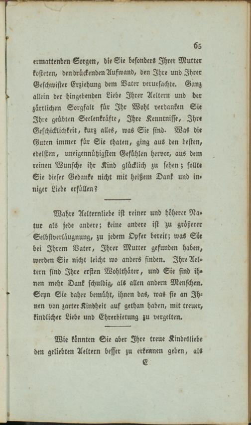 Wahre Aelternliebe ist reiner und höherer Na» tue als jede andere; keine andere ist zu größerer Selbstverlaugnung, zu jedem Opfer bereit; waS Sie bei Ihrem Vater, Ihrer Mutter gefunden haben, werden Sie nicht leicht wo anders finden. Ihre Aeltern sind Ihre ersten Wohlthäter, und Sie sind ihnen mehr Dank schuldig, als allen andern Menschen. Seyn Sie daher bemüht, ihnen das, was sie an Ihnen von zarter Kindheit auf gethan haben, mit treuer, kindlicher Liebe und Ehrerbietung zu vergelten.
