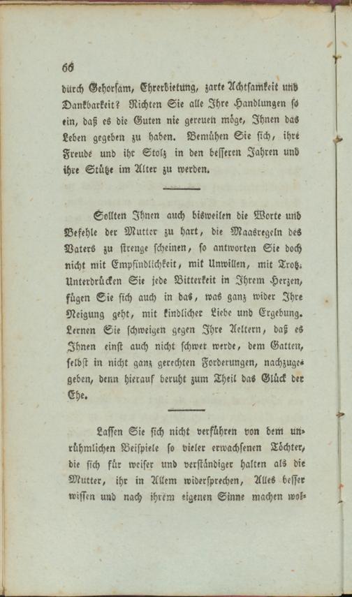 Sollten Ihnen auch bisweilen die Worte und Befehle der Mutter zu hart, die Maasregeln des Vaters zu strenge scheinen, so antworten Sie doch nicht mit Empfindlichkeit, mit Unwillen, mit Trotze Unterdrücken Sir jede Bitterkeit in Ihrem Herzen, fügen Sie sich auch in das, was ganz wider Ihre Neigung geht, mit kindlicher Liebe und Ergebung. Lernen Sie schweigen gegen Ihre Aeltern, daß es Ihnen einst auch nicht schwer werde, dem Gatten, selbst in nicht ganz gerechten Forderungen, nachzuge« geben, denn hierauf beruht zum Theil das Glück der Ehe.
