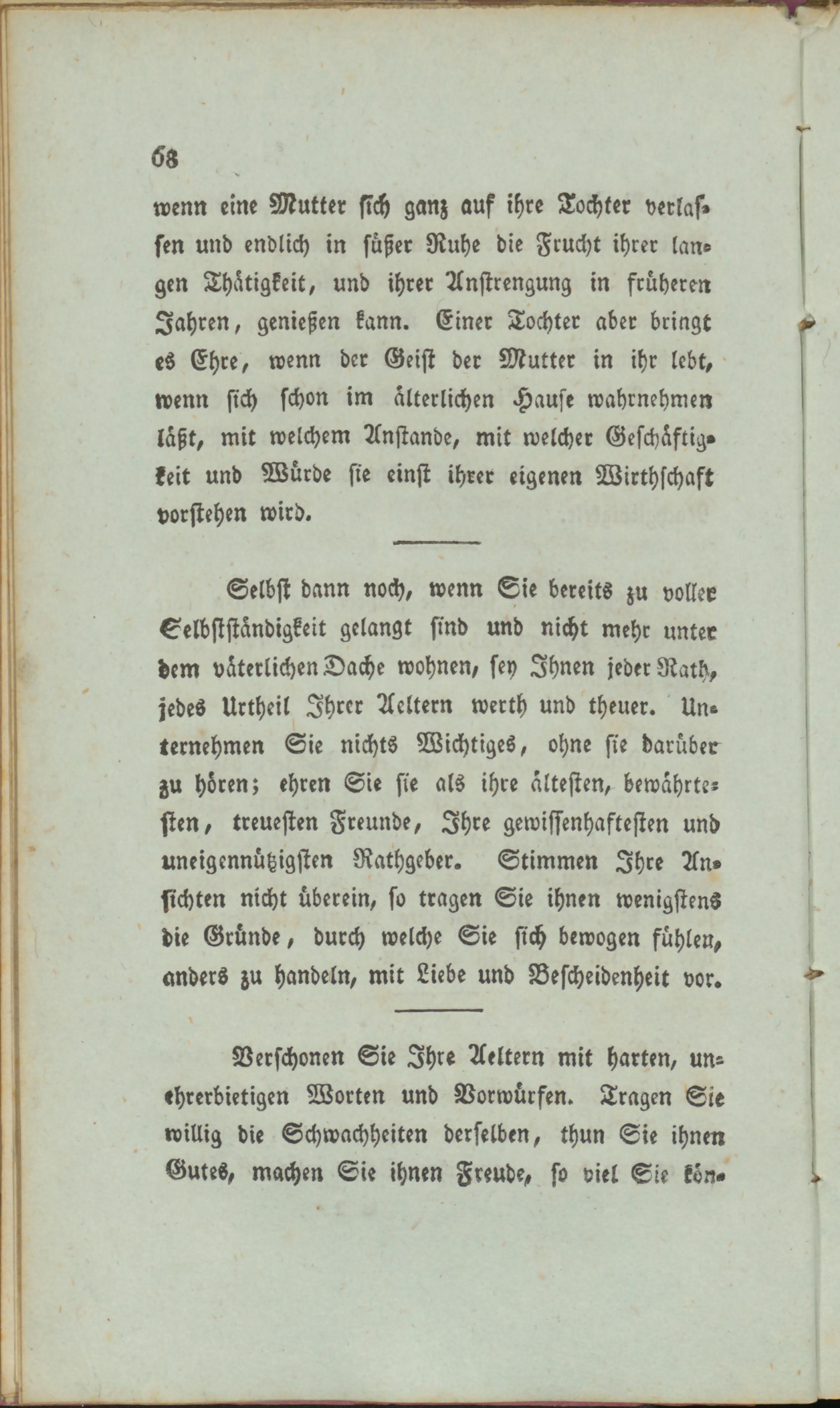 wenn eine Mutter sich ganz auf ihre Tochter verlassen und endlich in süßer Ruhe die Frucht ihrer langen Thätigkeit, und ihrer Anstrengung in früheren Jahren, genießen kann. Einer Tochter aber bringt es Ehre, wenn der Geist der Mutter in ihr lebt, wenn sich schon im alterlichen Hause wahrnehmen läßt, mit welchem Anstande, mit welcher Geschäftigkeit und Würde sie einst ihrer eigenen Wirthschaft vorstehen wird.