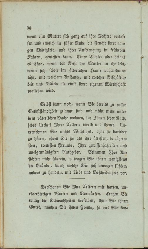 Selbst dann noch, wenn Sie bereits zu voller Selbständigkeit gelangt sind und nicht mehr unter dem väterlichen Dache wohnen, sey Ihnen jeder Rath, jedes Urtheil Ihrer Aeltern werth und theuer. Unternehmen Sie nichts Wichtiges, ohne sie darüber zu hören; ehren Sie sie als ihre ältesten, bewährtesten, Mussten Freunde, Ihre gewissenhaftesten und uneigennützigsten Rathgeber. Stimmen Ihre Ansichten nicht überein, so tragen Sie ihnen wenigstens die Gründe, durch welche Sie sich bewogen fühlen, anders zu handeln, mit Liebe und Bescheidenheit vor.