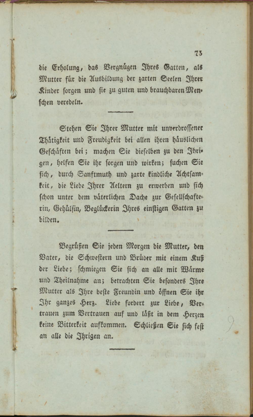 Stehen Sie Ihrer Mutter mit unverdrossener Thätigkeit und Freudigkeit bei allen ihren häuslichen Geschäften bei; machen Sie dieselben zu den Ihn« gen, helfen Sie ihr sorgen und wirken; suchen Sie sich, durch Sanftmuth und zarte kindliche Achtsamkeit, die Liebe Ihrer Aeltern zu erwerben und sich schon unter dem väterlichen Dache zur Gesellschafterin, Gehülfin, Beglückerin Ihres einstigen Gatten zu bilden.