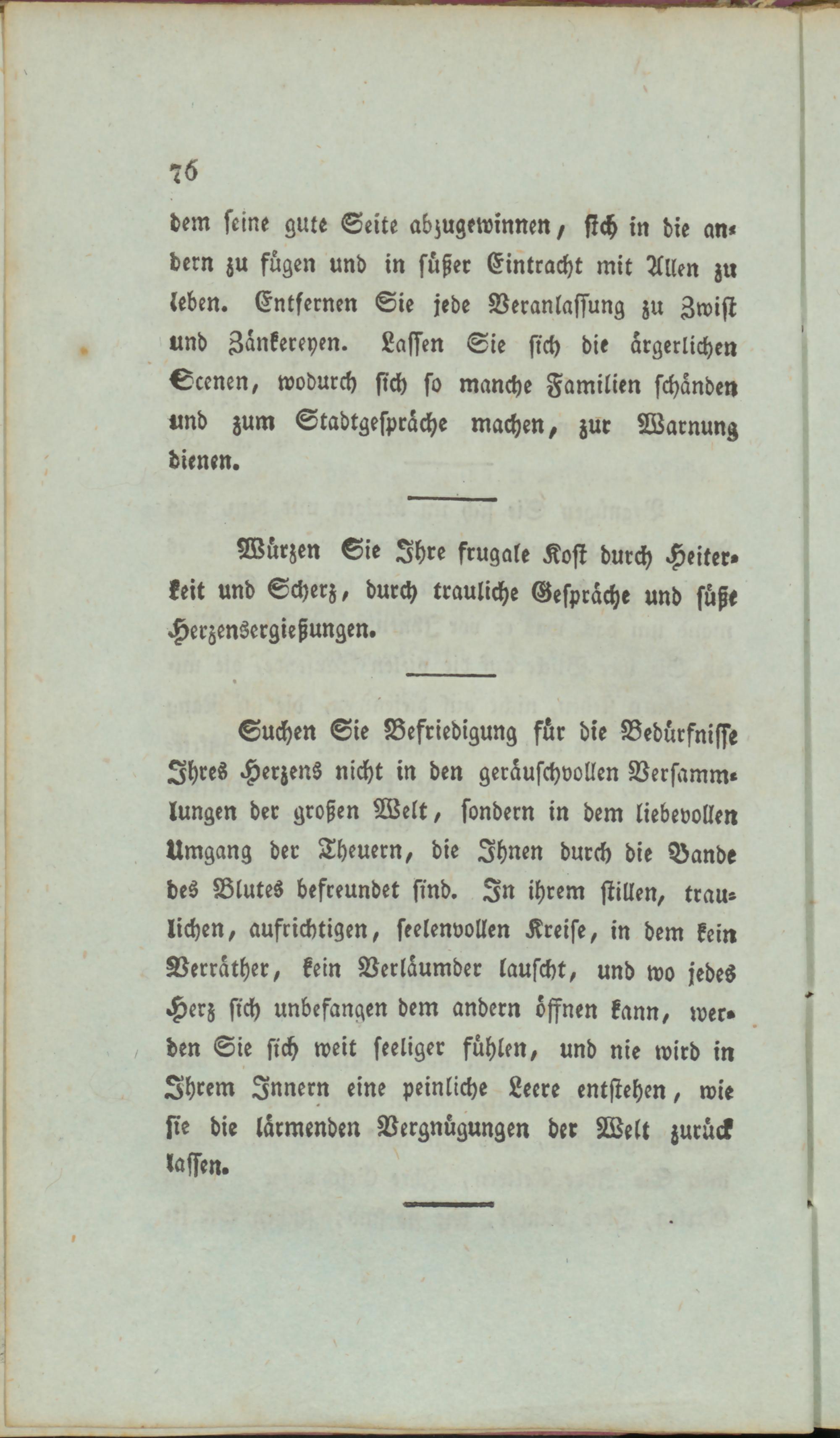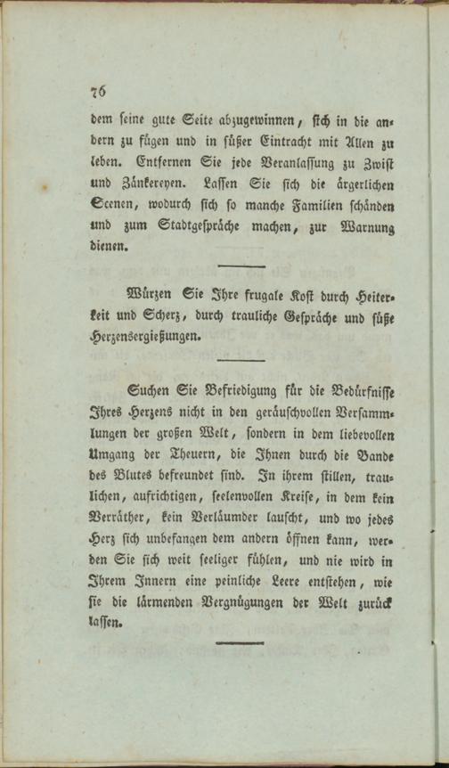 Suchen Sie Befriedigung für die Bedürfnisse Ihres Herzens nicht in den geräuschvollen Versamm» lungen der großen Welt, sondern in dem liebevollen Umgang der Theuern, die Ihnen durch die Bande des Blutes befreundet sind. In ihrem stillen, traulichen, aufrichtigen, seelenvollen Kreise, in dem kein Derrather, kein Verläumder lauscht, und wo jedes Herz sich unbefangen dem andern öffnen kann, wer» den Sie sich weit seeliger fühlen, und nie wird in Ihrem Innern eine peinliche Leere entstehen, wie sie die lärmenden Vergnügungen der Welt zurück lassen.