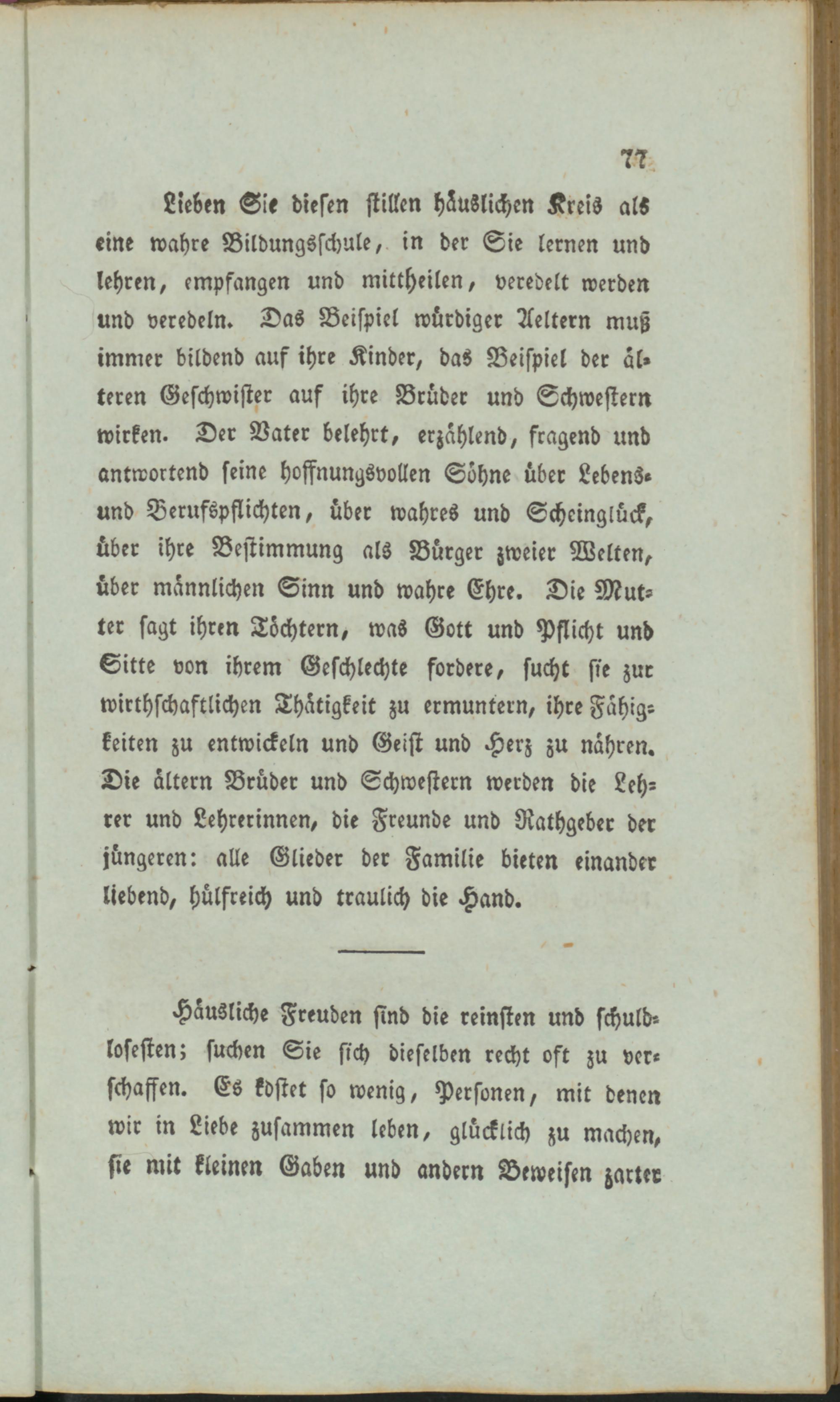 Häusliche Freuden sind die reinsten und schuldlosesten; suchen Sie sich dieselben recht oft zu verschaffen. Es kdstet so wenig, Personen, mit denen wir in Liebe zusammen leben, glücklich zu machen, sie mit kleinen Gaben und andern Beweisen zarter