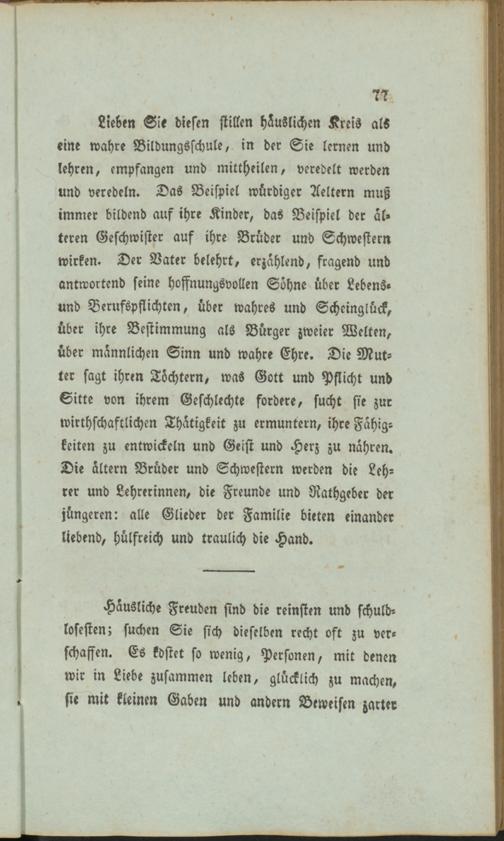 Lieben Sie diesen stillen häuslichen Kreis als eine wahre Bildungsschule, in der Sie lernen und lehren, empfangen und mittheilen, veredelt werden und veredeln. Das Beispiel würdiger Aeltern muß immer bildend auf ihre Kinder, das Beispiel der äl» teren Geschwister auf ihre Bruder und Schwestern wirken. Der Vater belehrt, erzählend, fragend und antwortend seine hoffnungsvollen Söhne über Lebens» und Derufspflichten, über wahres und Scheinglück, über ihre Bestimmung als Bürger zweier Welten, über männlichen Sinn und wahre Ehre. Die Mutter sagt ihren Töchtern, was Gott und Pflicht und Sitte von ihrem Geschlechte fordere, sucht sie zur wirthschaftlichen Thätigkeit zu ermuntern, ihre Fähigkeiten zu entwickeln und Geist und Herz zu nähren. Die ältern Brüder und Schwestern werden die Lehrer und Lehrerinnen, die Freunde und Rathgeber der jüngeren: alle Glieder der Familie bieten einander liebend, hülfreich und traulich die Hand.