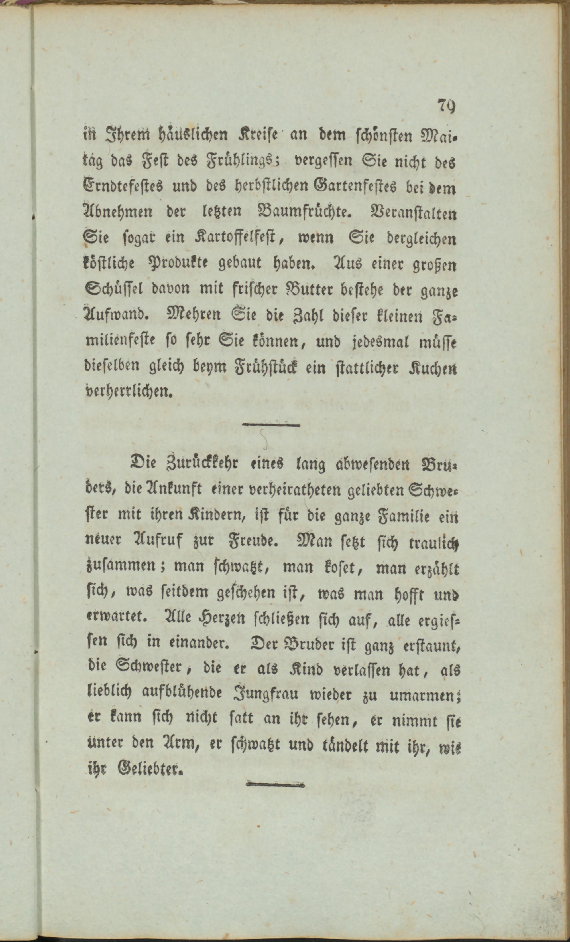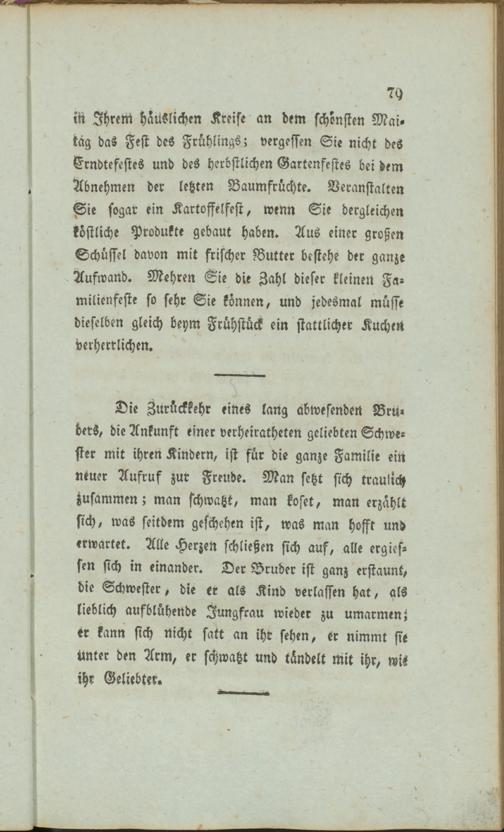 Die Zurückkehr eines lang abwesenden Bruder-, die Ankunft einer verheiratheten geliebten Schwester mit ihren Kindern, ist für die ganze Familie ein neuer Aufruf zur Freude. Man setzt sich traulich zusammen; man schwatzt, man koset, man erzählt sich, was seitdem geschehen ist, was man hofft und erwartet. Alle Herzen schließen sich auf, alle ergies- sen sich in einander. Der Bruder ist ganz erstaunt, die Schwester, die er als Kind verlassen hat, als lieblich aufblühende Jungfrau wieder zu umarmen j er kann sich nicht satt an ihr sehen, er nimmt sie unter den Arm, er schwatzt und tändelt Mit ihr, wie ihr Geliebter.