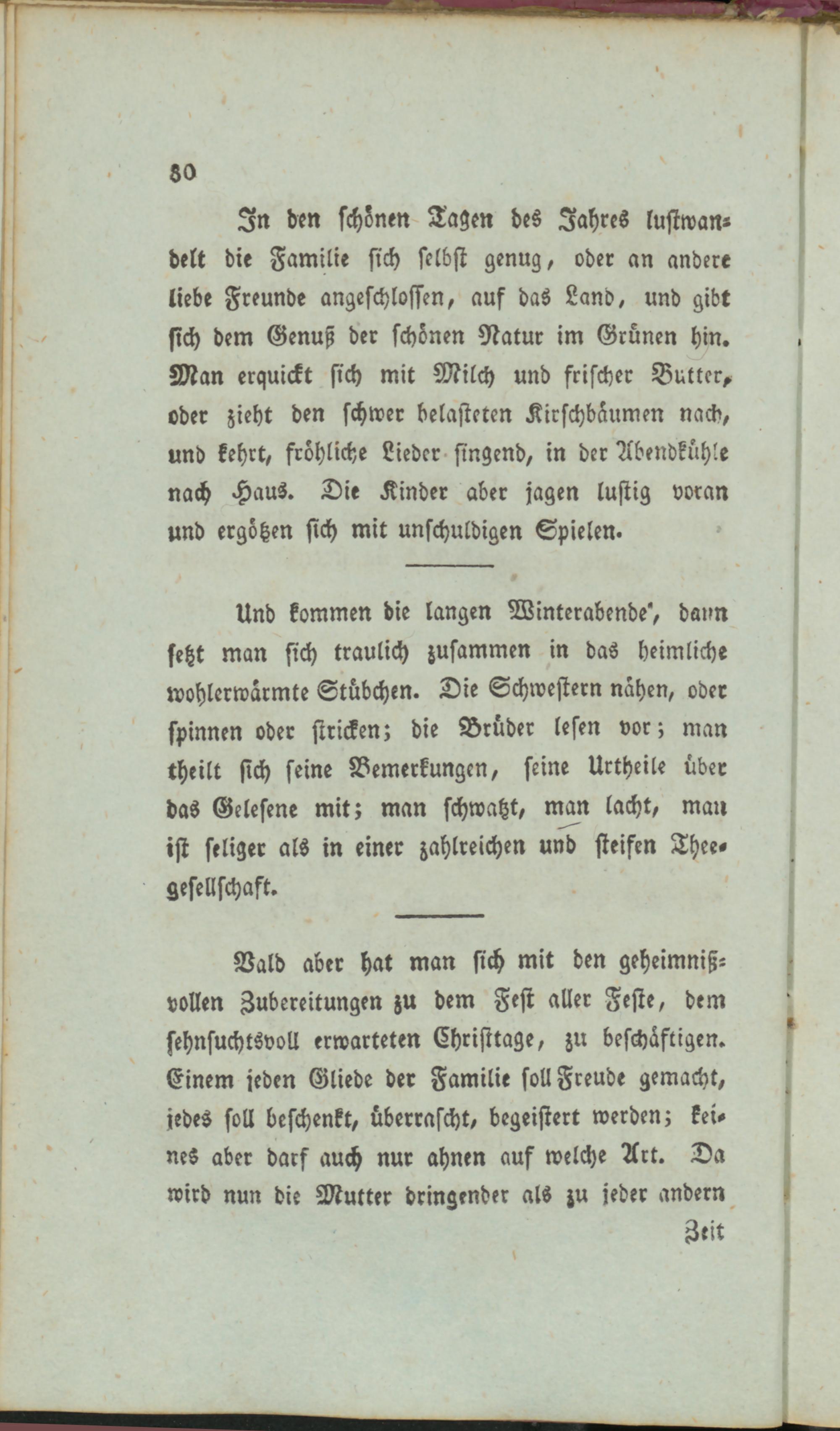 In den schönen Tagen des Jahres lustwandelt die Familie sich selbst genug, oder an andere liebe Freunde angeschlossen, auf das Land, und gibt sich dem Genuß der schönen Natur im Grünen hin. Man erquickt sich mit Milch und frischer Butter, oder zieht den schwer belasteten Kicschbäumen nach, und kehrt, fröhliche Lieder singend, in der Abendkühle nach Haus. Die Kinder aber jagen lustig voran und ergötzen sich mit unschuldigen Spielen.