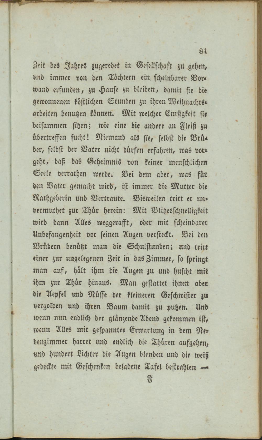 Zeit des JahreS zugeredet in Gesellschaft zu gehen, und immer von den Töchtern ein scheinbarer Vor» wand erfunden, zu Hause zu bleiben/ damit sie die gewonnenen köstlichen Stunden zu ihren Weihnächte» arbeiten benutzen können. Mit welcher Emsigkeit sie beisammen sitzen; wie eine die andere an Fleiß zu übertreffen sucht! Niemand als sie, selbst die Brü» der, selbst der Vater nicht dürfen erfahren, was vorgeht, daß das Geheimnis von keiner menschlichen Seele verrathen werde. Bei dem aber, was für den Vater gemacht wird, ist immer die Mutter die Rathgeberin und Vertraute. Bisweilen tritt er un» vermuthet zur Thür herein: Mit Dlitzesschnelligkeit wird dann Alles weggerafft, oder mit scheinbarer Unbefangenheit vor seinen Augen versteckt. Bei den Brudern benutzt man die Schulstunden; und tritt einer zur ungelegenen Zeit in das Zimmer, so springt man auf, halt ihm die Augen zu und huscht mit ihm zur Thür hinaus. Man gestattet ihnen aber die Aepfel und Nüsse der kleineren Geschwister zu vergolden und ihren Baum damit zu putzen. Und wenn nun endlich der glänzende Abend gekommen ist, wenn Alles mit gespannter Erwartung in dem Nebenzimmer harret und endlich die Thüren aufgehen, und hundert Lichter die Augen blenden und die weiß gedeckte mit Geschenken beladene Tafel bestrahlen —>